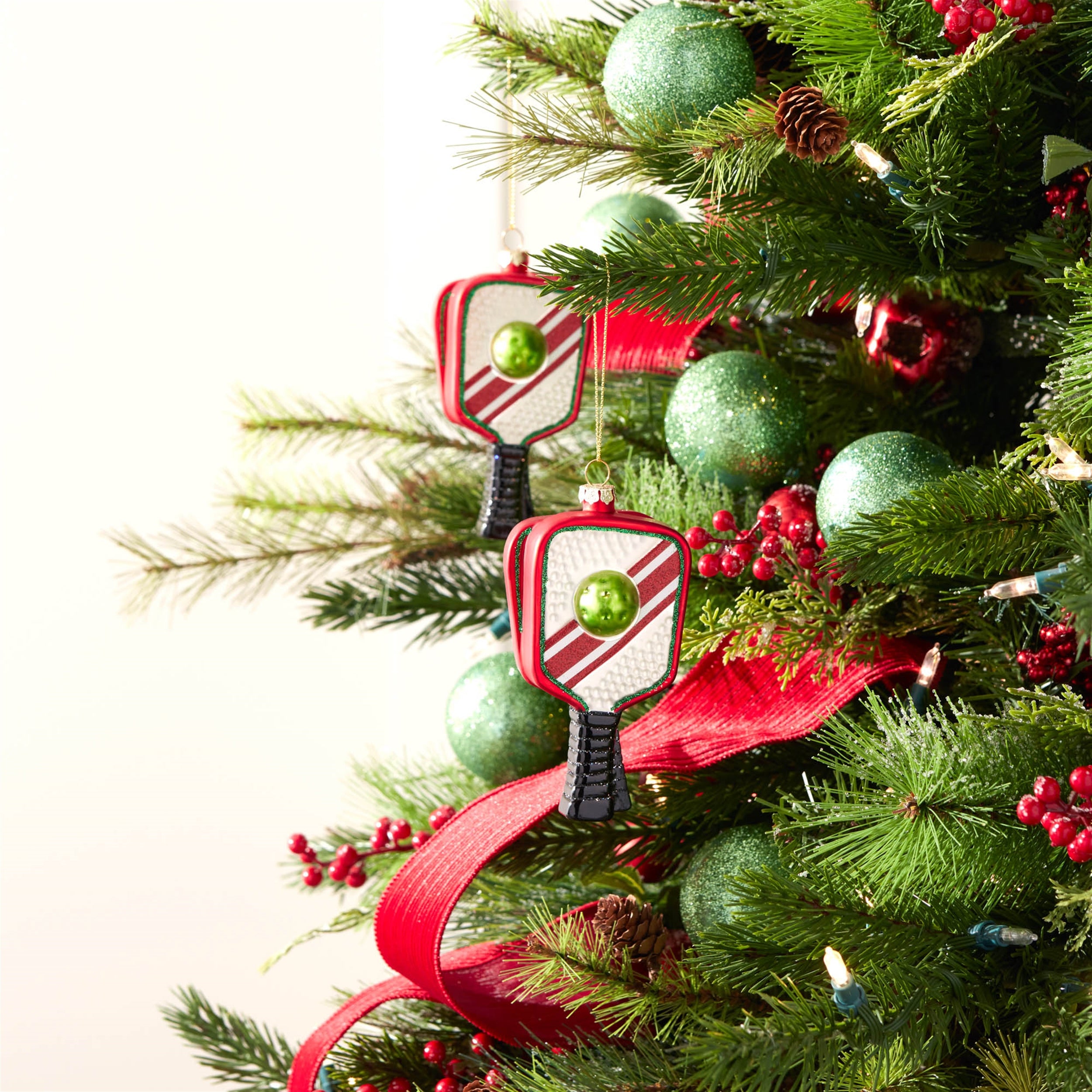 - Glass pickleball racket design with ball detail for sports-themed holiday décor