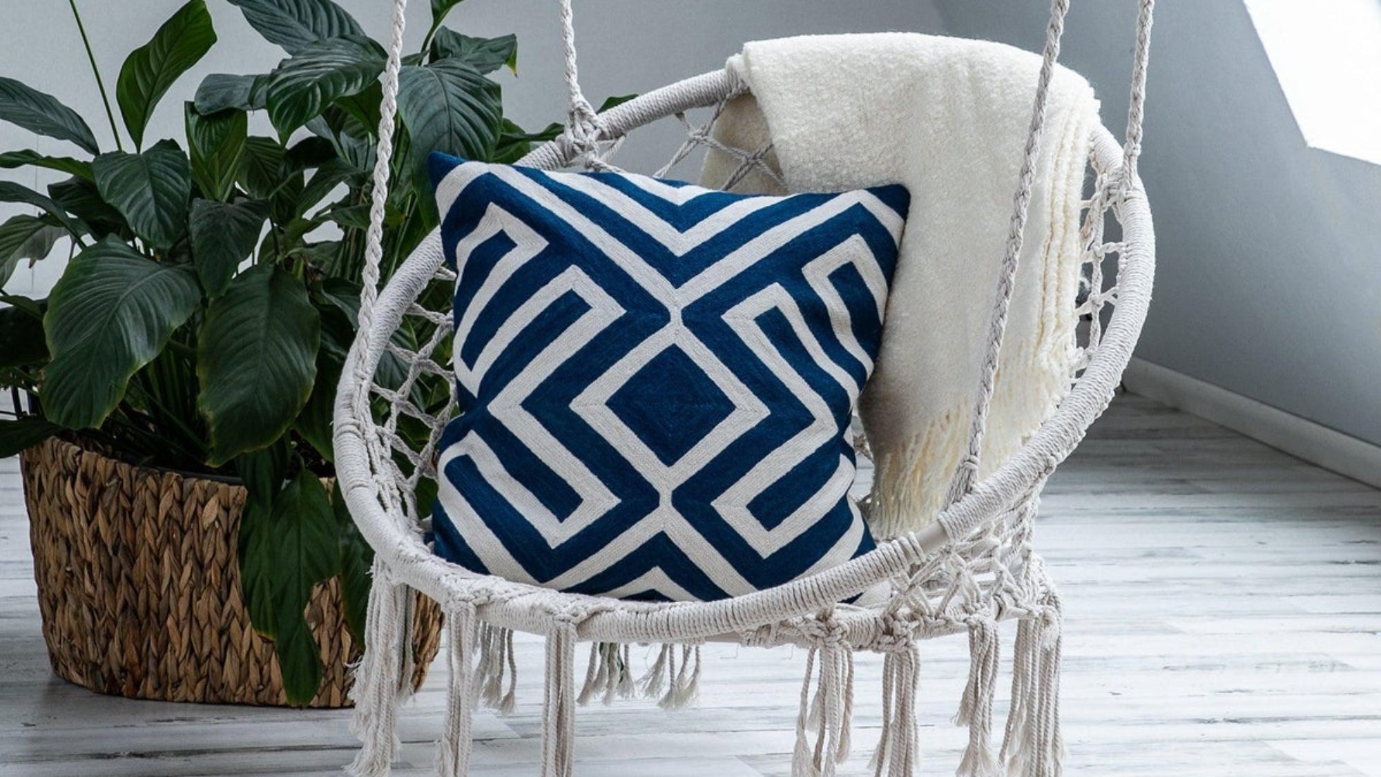 Square Cushion Blue and White Crewel Cotton Geometric Indoor Accent Pillow 20" W x 20" H By Auskin
