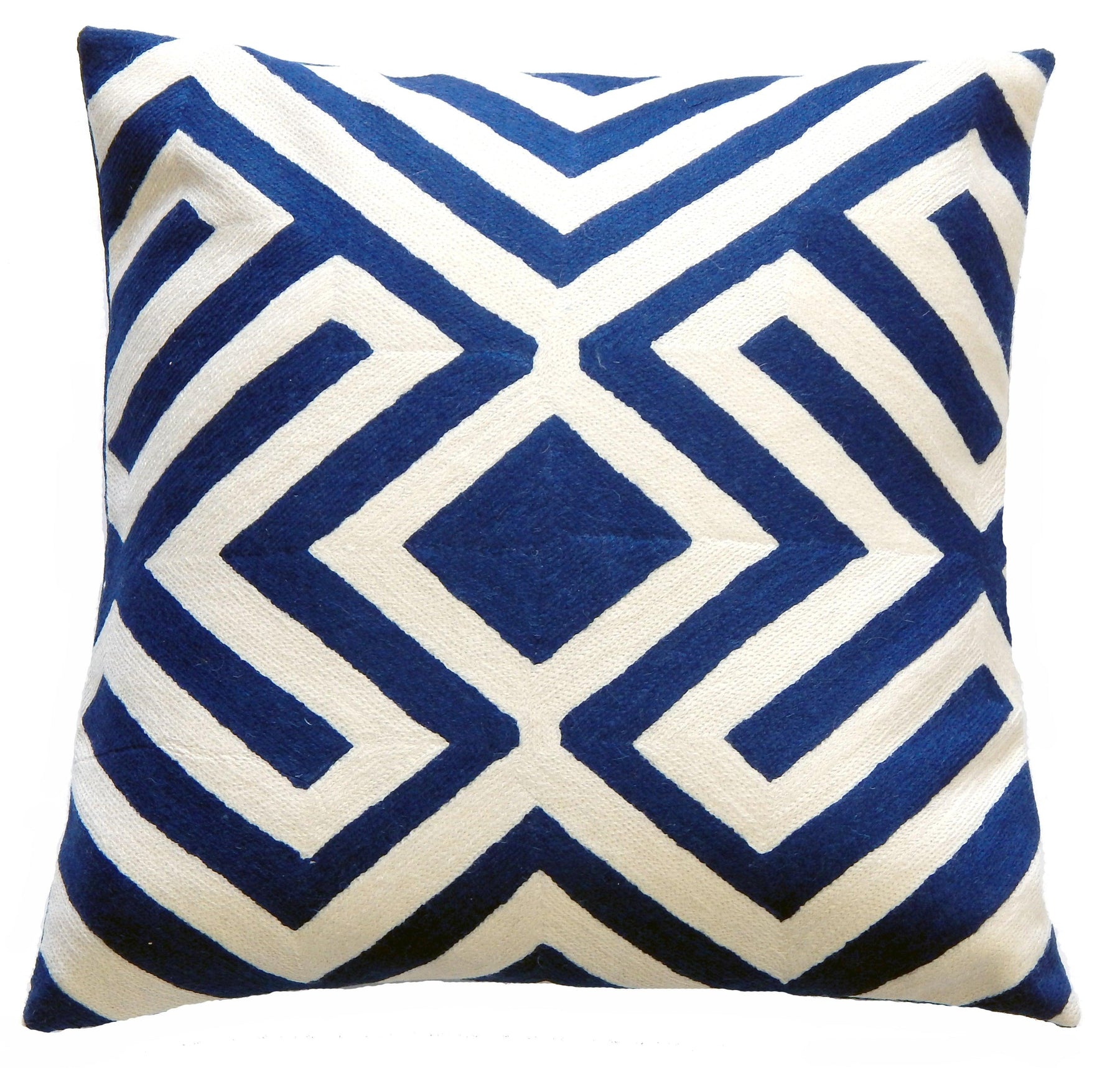 Square Cushion Blue and White Crewel Cotton Geometric Indoor Accent Pillow 20" W x 20" H