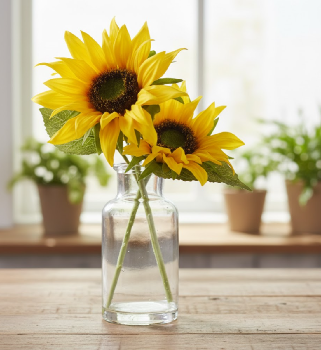 This sunflower floral vase set adds a cheerful touch to indoor décor with lasting, maintenance-free style. Each arrangement features vibrant faux sunflowers crafted from polyester with rich green leaves, set in a clear glass vase for a clean and balanced look. Measuring 12 inches high, these tabletop arrangements are ideal for shelves, dining tables, consoles, or windowsills. Designed to complement spring, summer, or autumn décor, they bring warmth and color to everyday spaces without the need for watering or upkeep. Sold as a coordinated set of two, these sunflower arrangements create a cohesive and inviting display in any room.