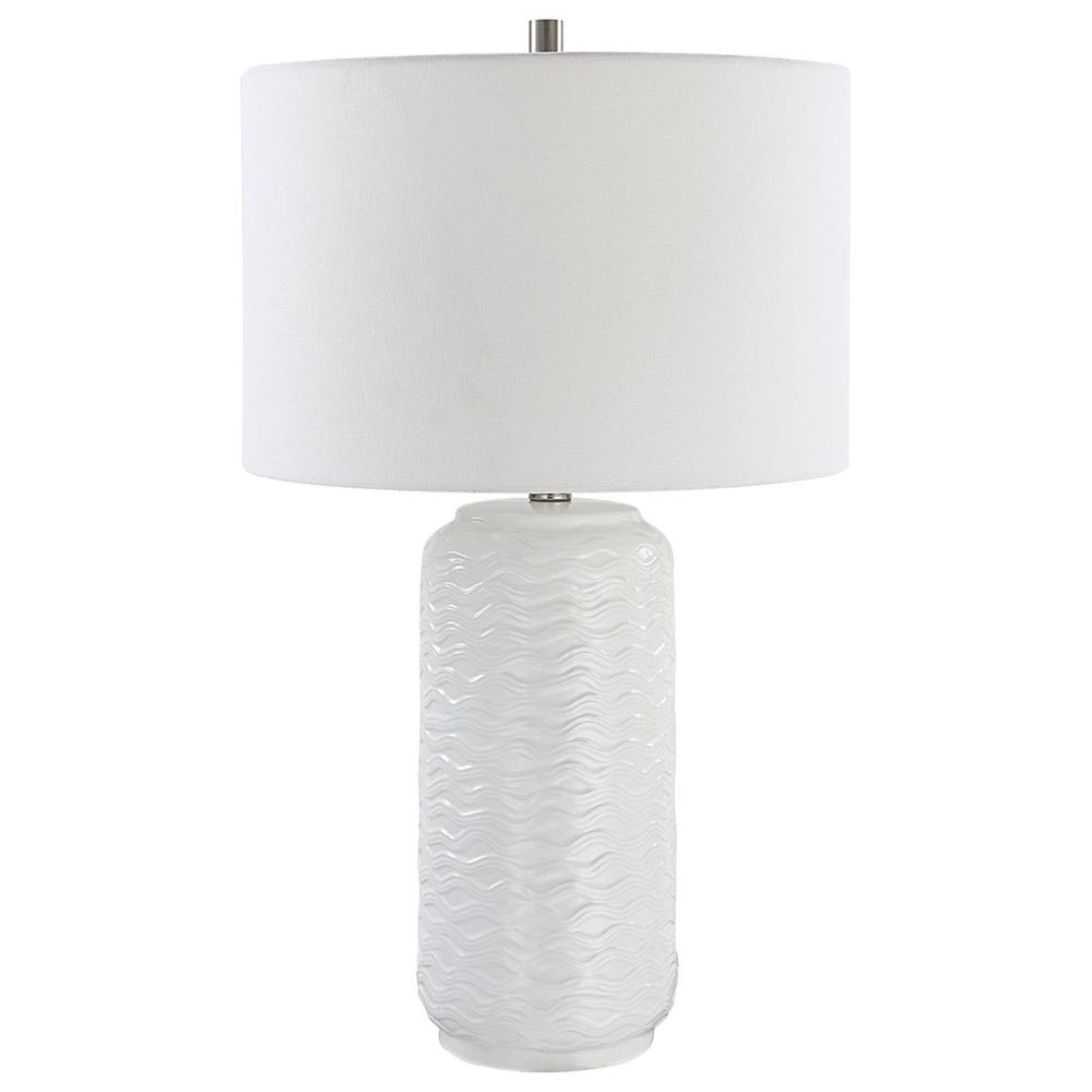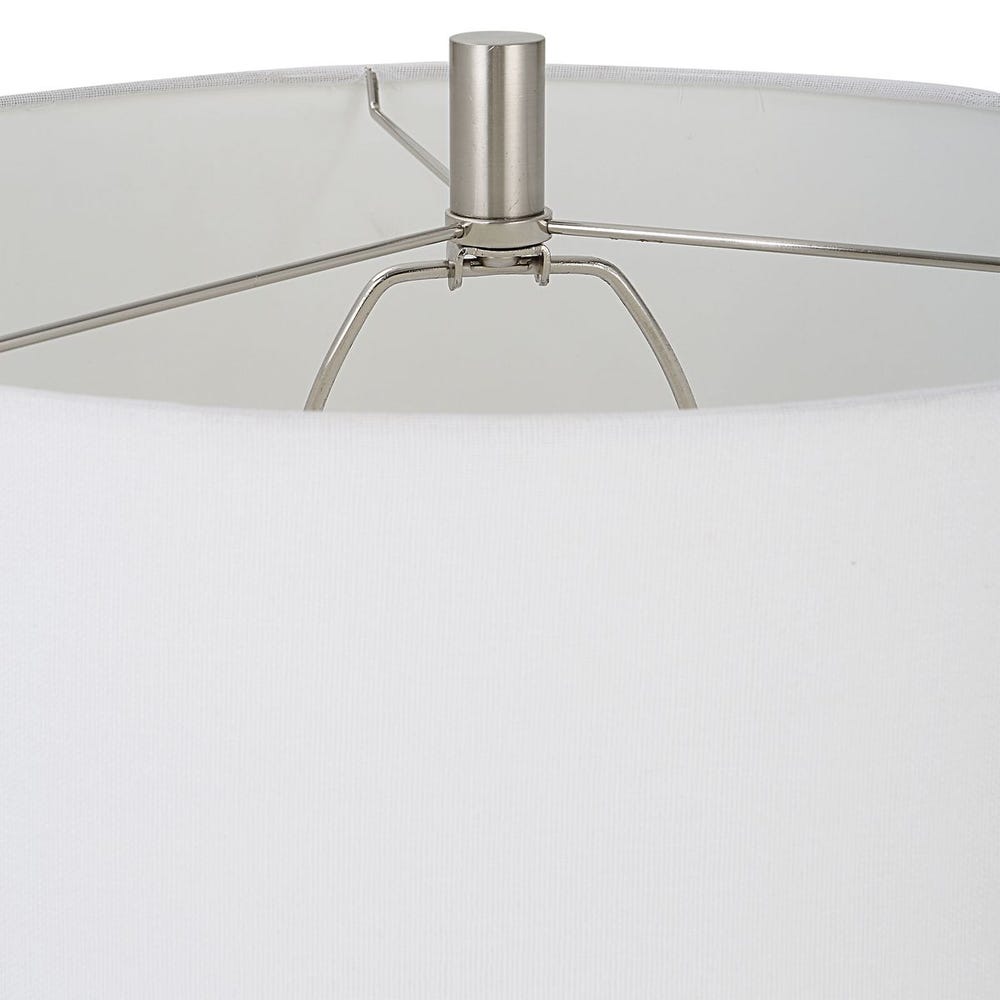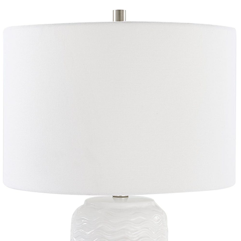 Add refined modern elegance to your interior lighting with this decorative Ceramic Table Lamp. Featuring a sculptural white ceramic base with a subtle wavy textured surface, the lamp introduces depth and artistic character to tabletops while maintaining a clean and contemporary aesthetic. Brushed nickel accents provide a polished metallic contrast that enhances the minimalist design.
