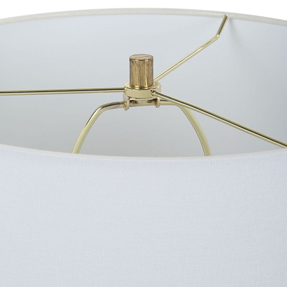 Standing 28 inches in height, this lamp is ideal for bedside tables, living room side tables, or entryway consoles where both decorative style and practical lighting are desired. The round drum hardback shade crafted from white linen fabric softly diffuses illumination, balancing the bold metallic base with a clean and neutral finish.