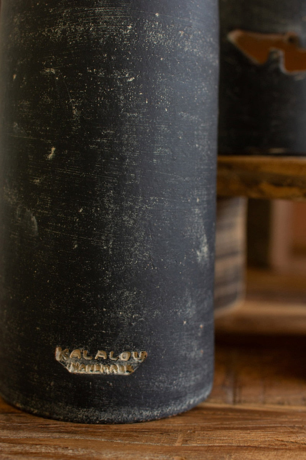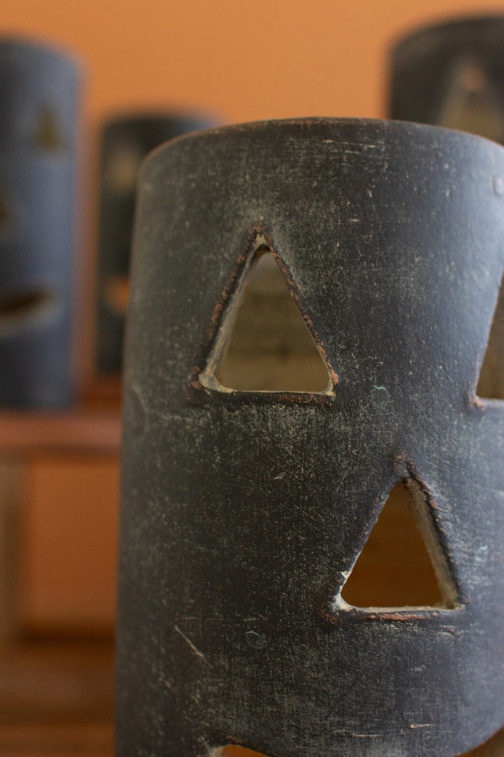 - Tall black clay jack-o-lantern luminary with carved facial openings
