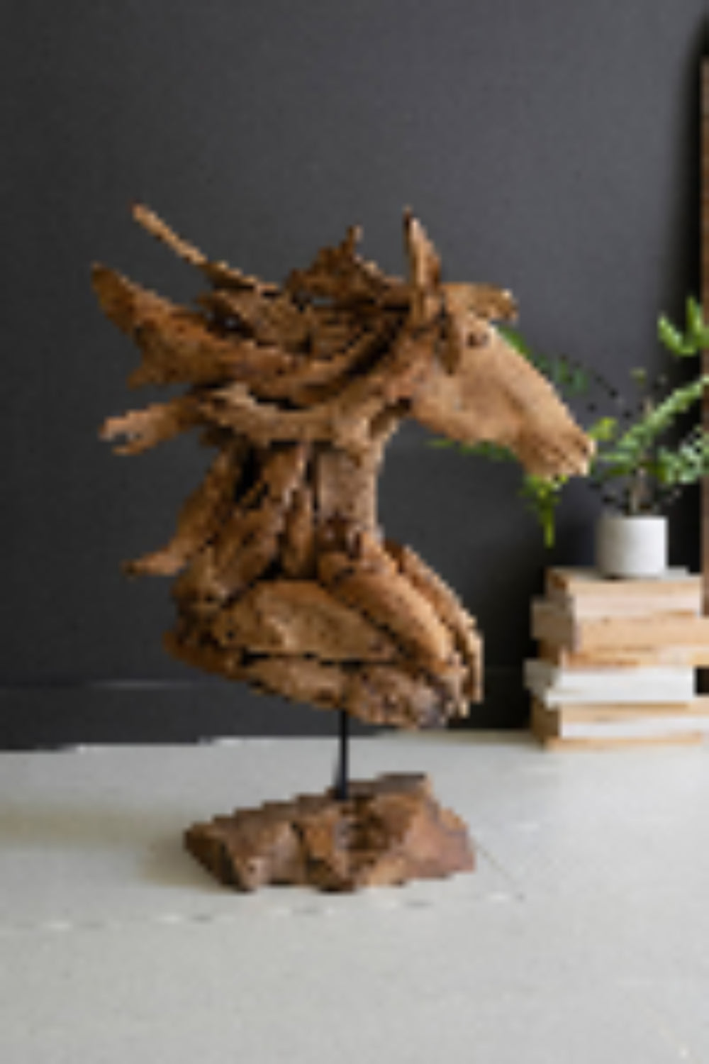Teakwood Horse Head Sculpture with Iron Base – 30" Tall Rustic Decor