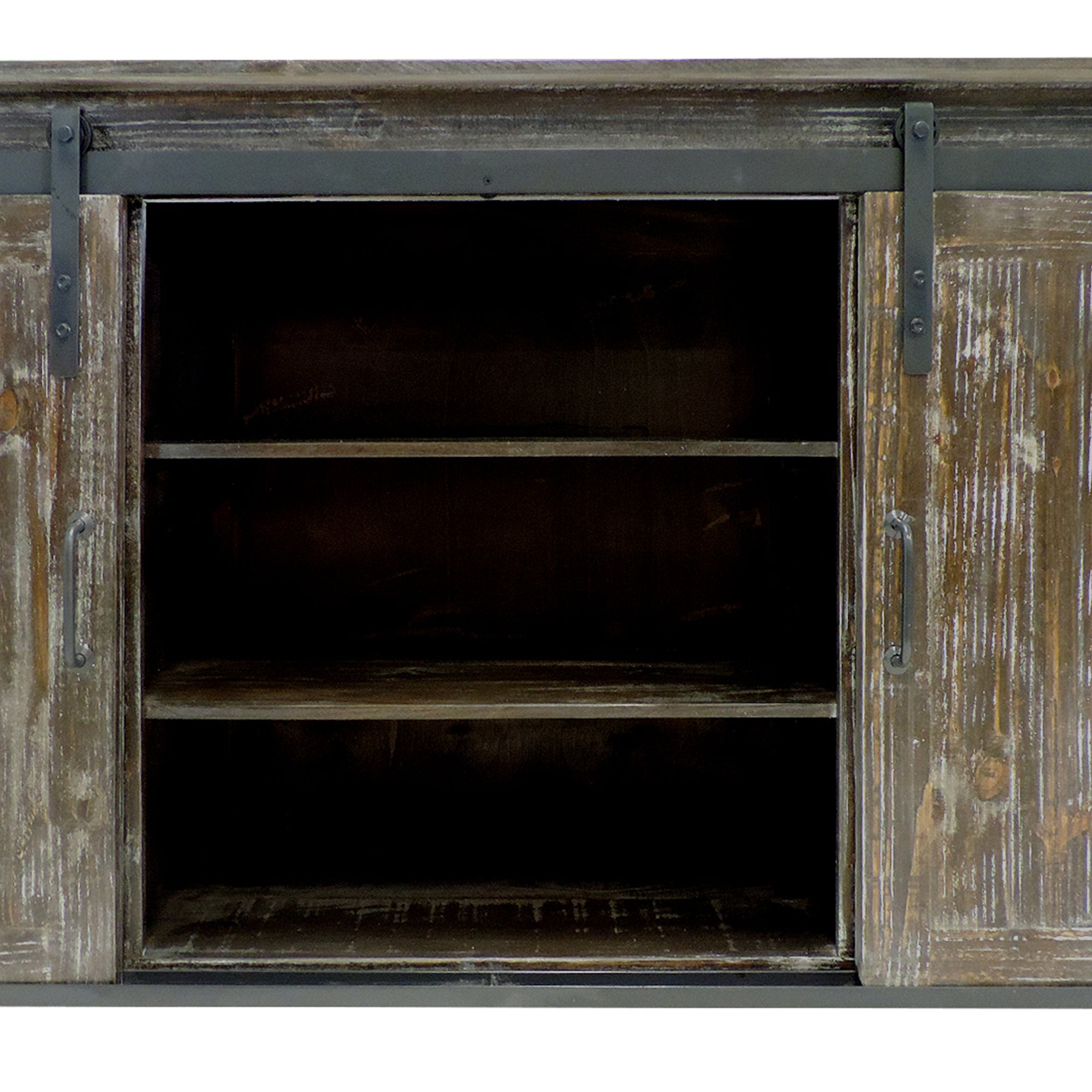 Bring this spacious console home that offers additional storage with the inclusion of this 60 `` storage console, featuring plank style wooden construction with distressed brown finish. It features 6 spacious drawers with cutouts for easy access and sliding barn door cabinet with interior shelving and antique metal bar handles. Due to the handcrafted nature of the product, there may be variation in color, finish, wood grain and knots.