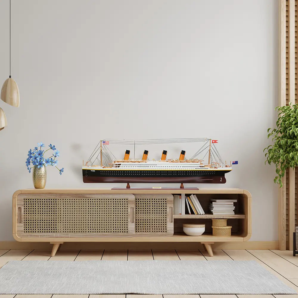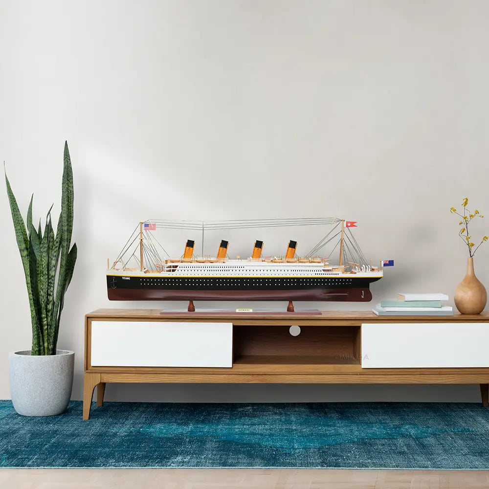 The Titanic Painted XL is a handcrafted wooden model of the historic RMS Titanic, measuring 19.25 inches tall. Built using the traditional “plank on frame” method, each piece is carefully shaped and assembled by skilled craftsmen over 150 hours of work. The ship is painted in authentic red, white, and black colors and detailed with metal rails, life boats, anchors, and rigging. Resting on a solid wood base with a metal nameplate, this collectible piece brings maritime history and craftsmanship into your home or office display.