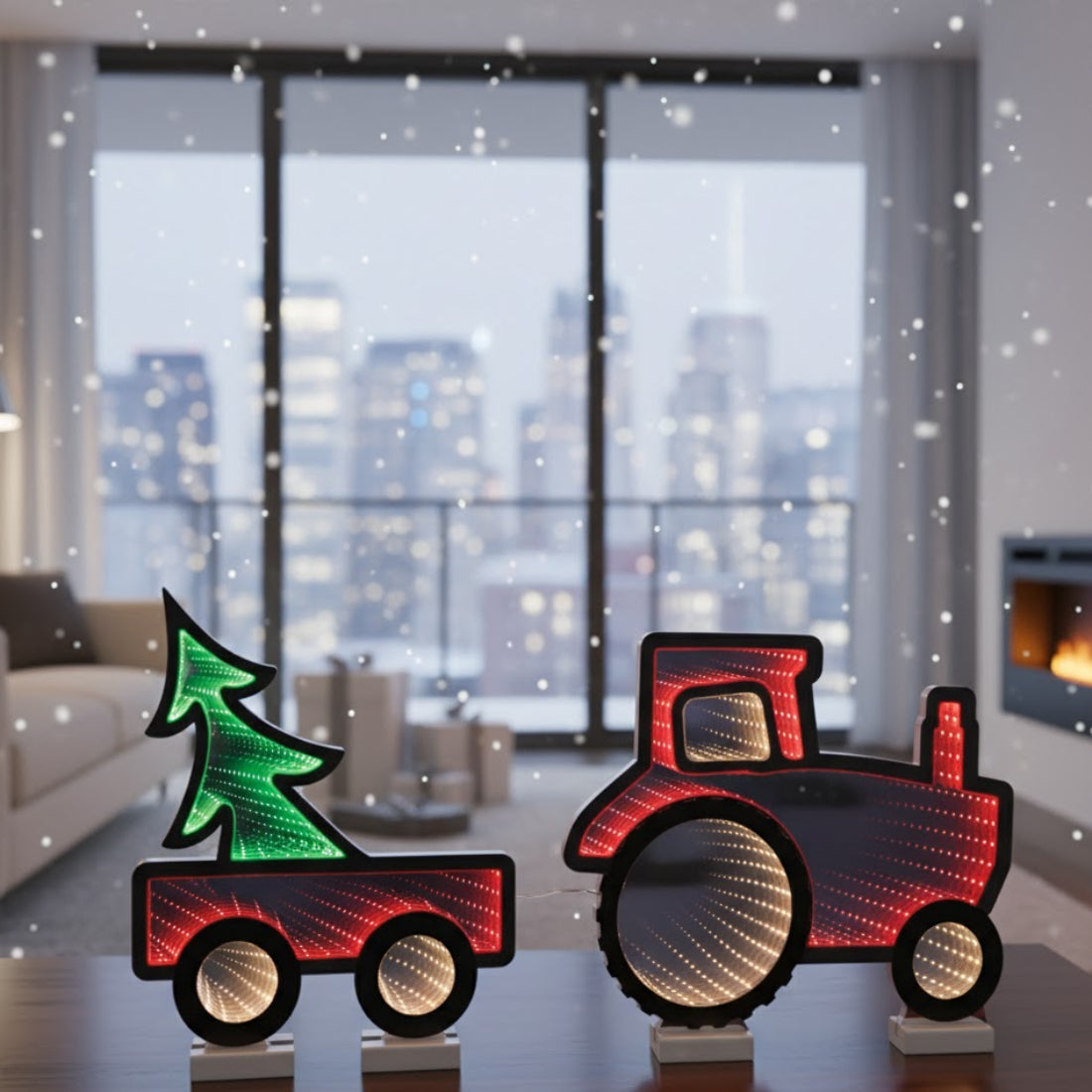 Add nostalgic charm to your seasonal décor with the Holiday Tractor and Wagon Ekko Light Display, standing 29.5" tall and designed with a captivating infinity-light effect. The glowing tunnel of red, green, and warm LED illumination brings a magical sense of depth and motion to the classic tractor-and-wagon silhouette. A festive pine tree accent adds a warm holiday touch, making this piece an eye-catching addition to mantels, console tables, window displays, or covered outdoor spaces. Crafted from durable acrylic, PET plastic, and EVA foam, it delivers long-lasting holiday appeal. Powered by a UL-listed plug, this radiant décor piece brings joyful light and timeless farmhouse charm to your holiday home year after year.