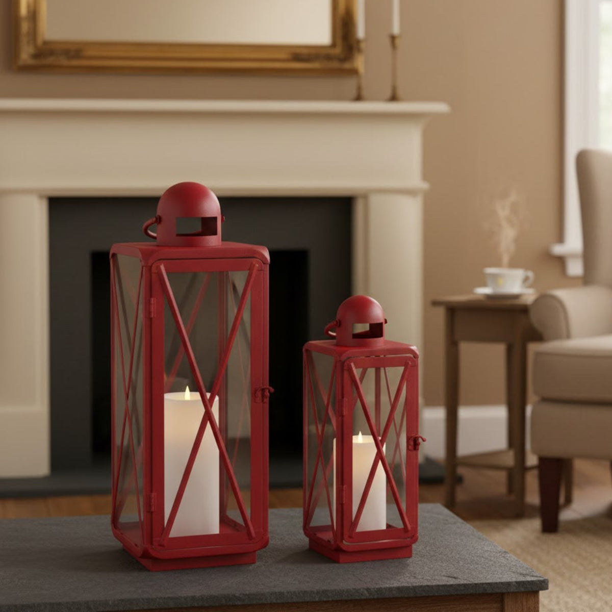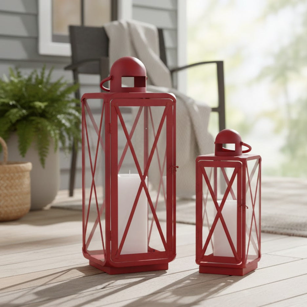 candle lanterns for home,classic metal lantern pair,curved metal lanterns,decorative lantern set,hanging metal lanterns,home accent lighting,indoor candle holders,pillar candle lantern set,red home decor accents,red metal lantern set,rustic red lanterns,tabletop lantern decor,traditional lantern decor