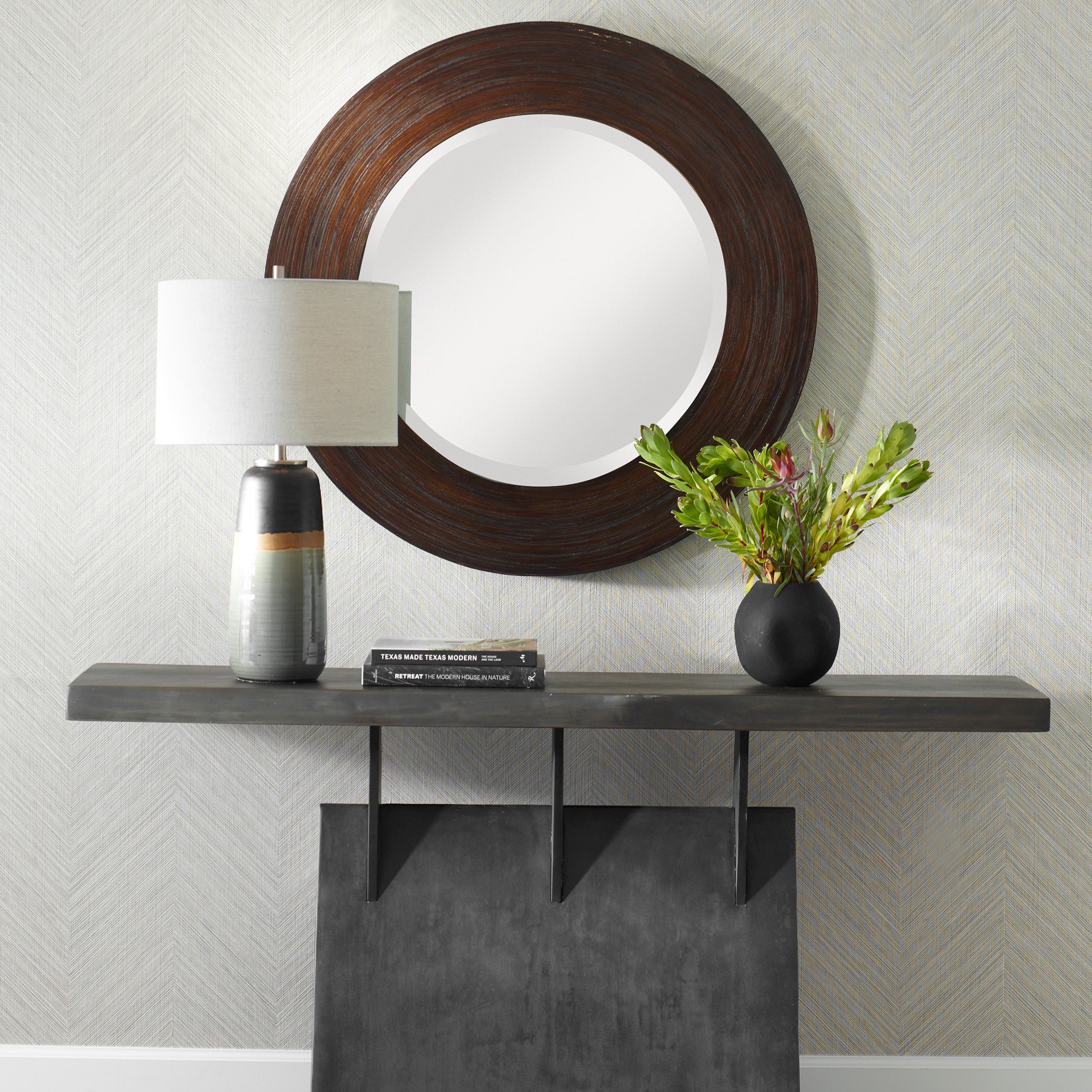 Uttermost 08178 Dutton Dark Walnut Round Mirror with Layered Bamboo Frame
