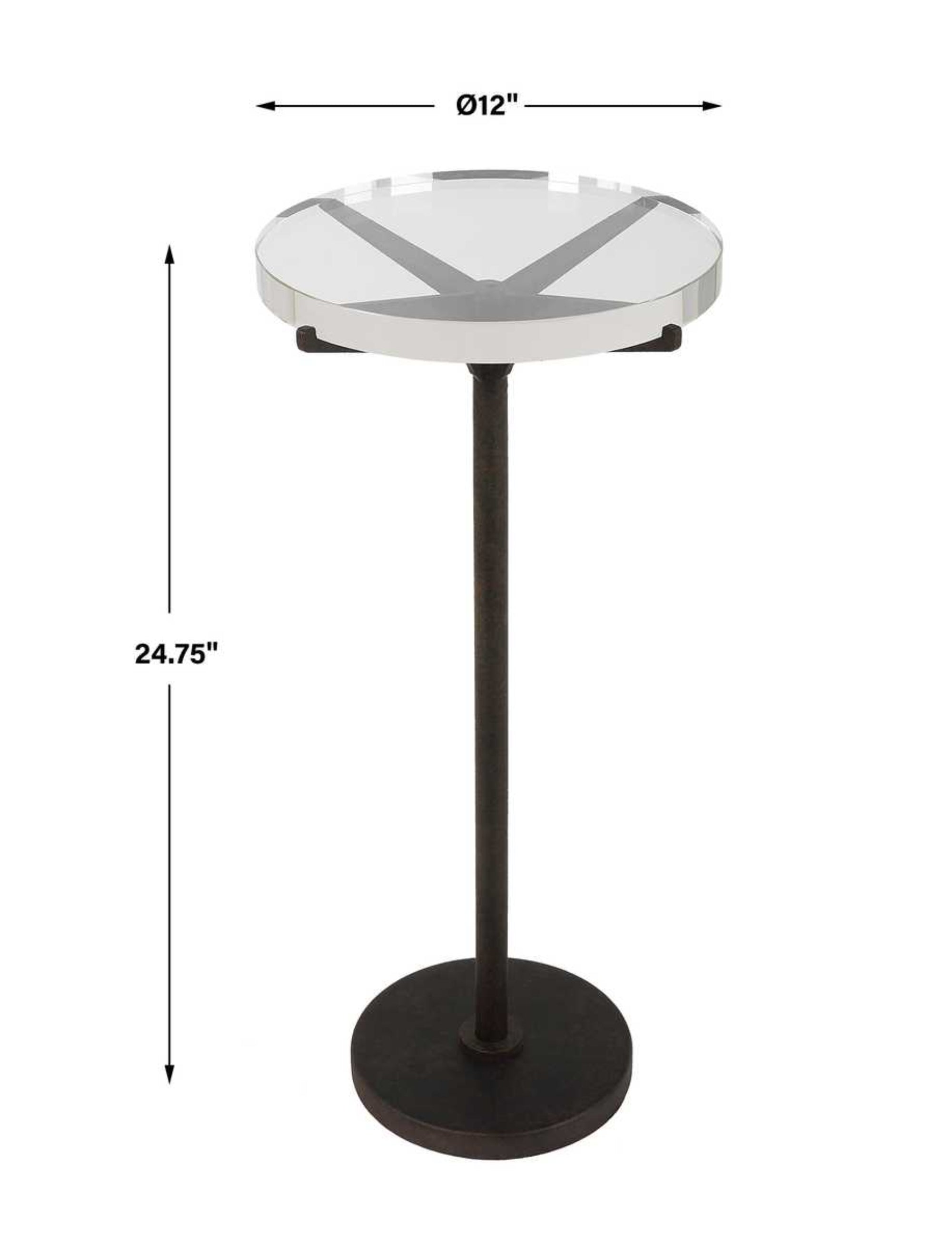 Elevate your space with the Uttermost Forge Industrial Accent Table. Its sparkling crystal top combined with a sturdy iron frame delivers both modern glam and industrial charm, making it a versatile accent piece.Measuring 12 inches wide, 12 inches deep, and 24.75 inches high, this side table fits perfectly next to chairs, sofas, or in corners. The reflective crystal surface adds elegance while the iron frame ensures durability.