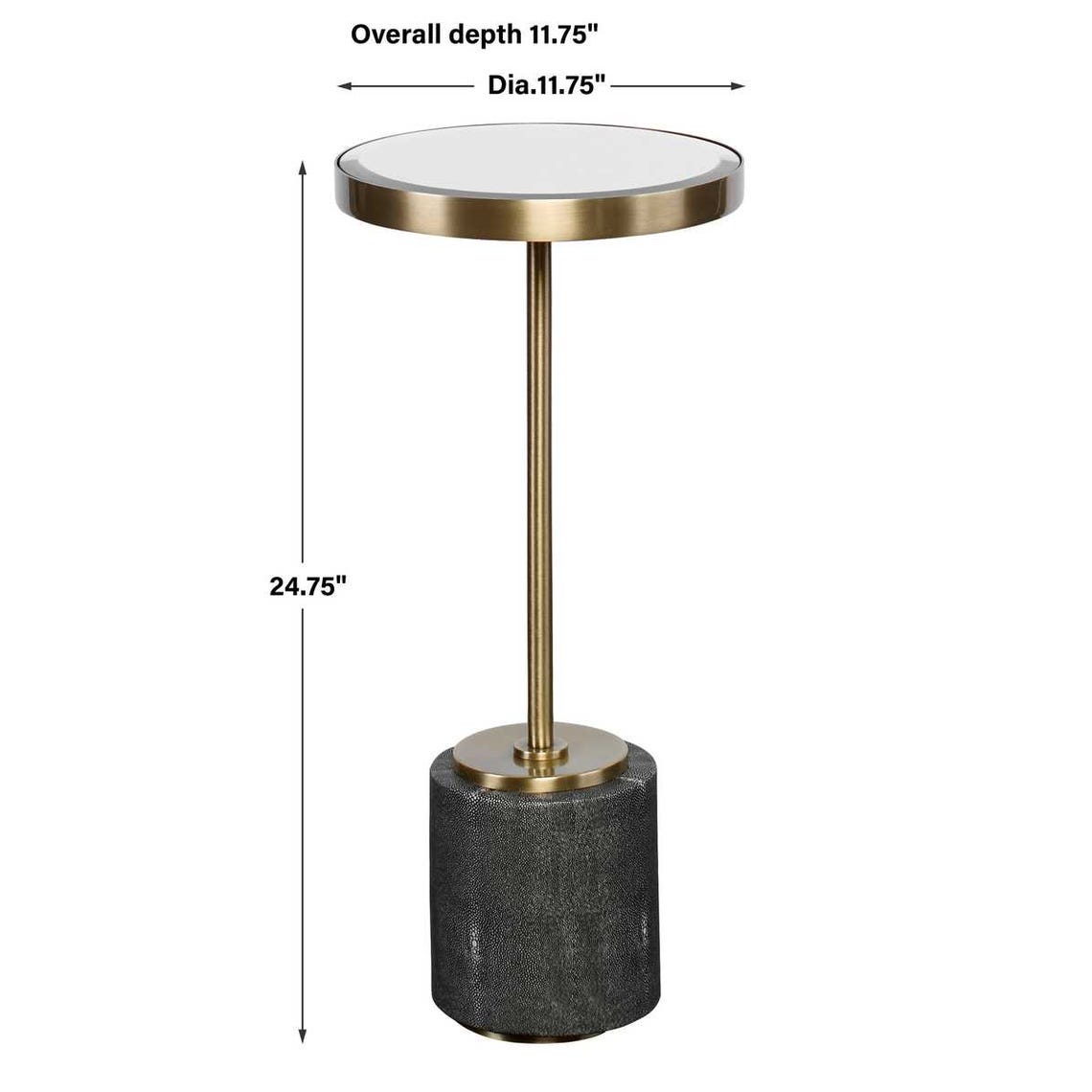 The Uttermost Laurier Mirrored Accent Table offers a striking mix of textures and tones, perfect for elevating any modern or transitional interior. Designed by David Frisch, this stylish round table stands 24.75 inches tall and features an 11.75-inch diameter. It pairs a gray faux shagreen-wrapped base with a rich brushed brass iron support and is topped with a beveled mirrored surface that reflects both light and sophistication. Ideal for living rooms, bedrooms, or entryways, it serves as a functional accent with high-end flair.