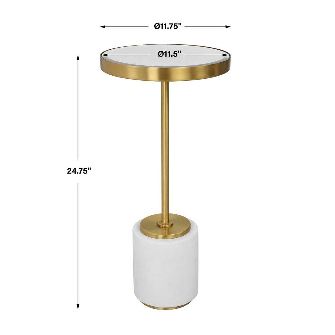 Elevate any space with the Uttermost Laurier White Drink Table, a chic fusion of classic materials and modern style. Featuring a cylindrical base wrapped in fresh white faux shagreen, this compact 24.75” tall table is accented with a brushed brass-finished iron support and topped with a beveled mirror surface for a touch of glam. Measuring 11.75” wide and deep, the Laurier table is the perfect size for a cocktail, a candle, or a curated decorative piece. Its sophisticated silhouette blends seamlessly into transitional, contemporary, or luxe interiors.