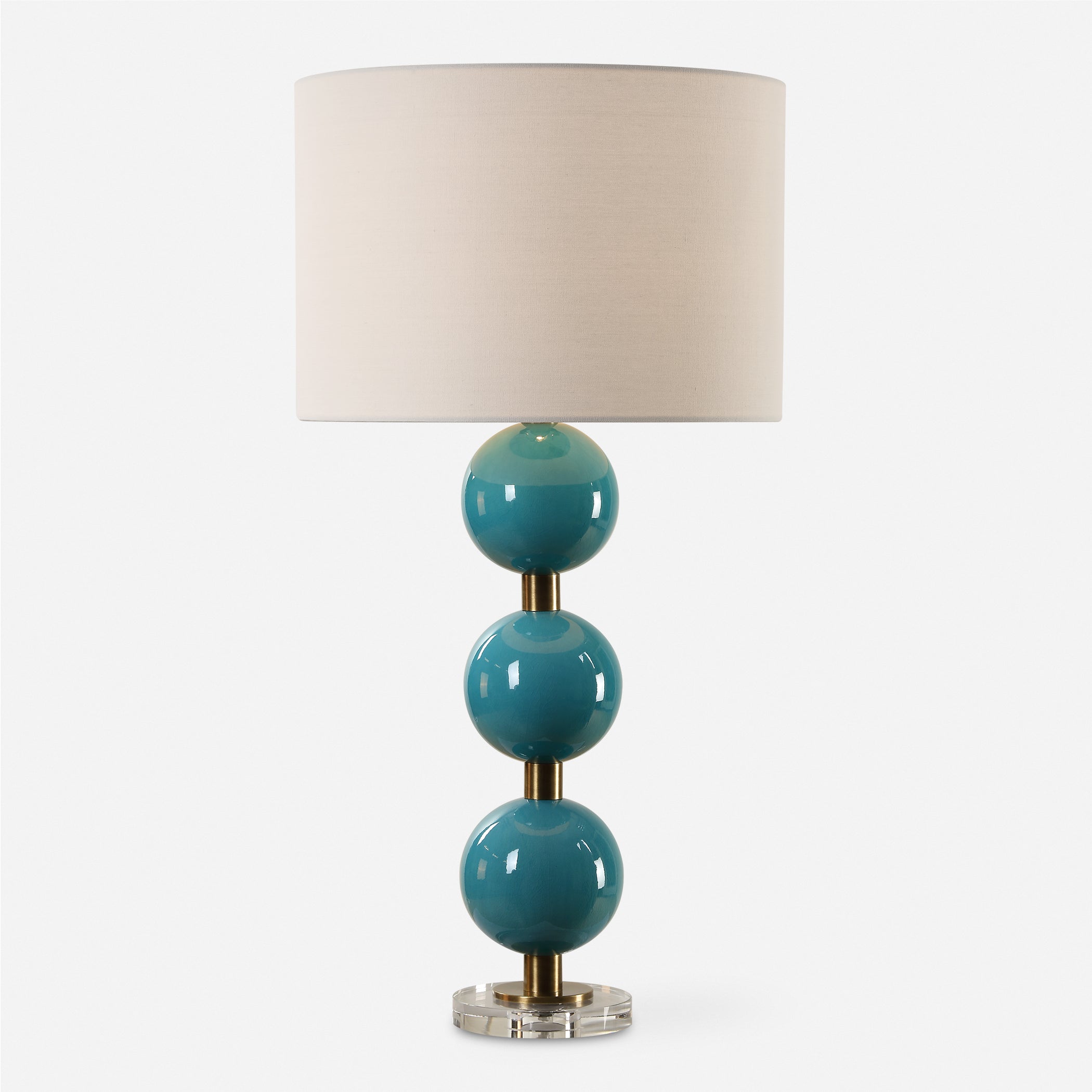 The Palawan Blue Glaze Table Lamp with Stacked Ceramic Spheres and Brass Accents is a striking fusion of coastal vibrance and refined design. Its base features stacked ceramic spheres finished in a mesmerizing crackled turquoise blue glaze, reminiscent of oceanic tones. This lively coloration is elegantly grounded by antique brass details and a substantial crystal foot, offering a timeless yet artistic look.