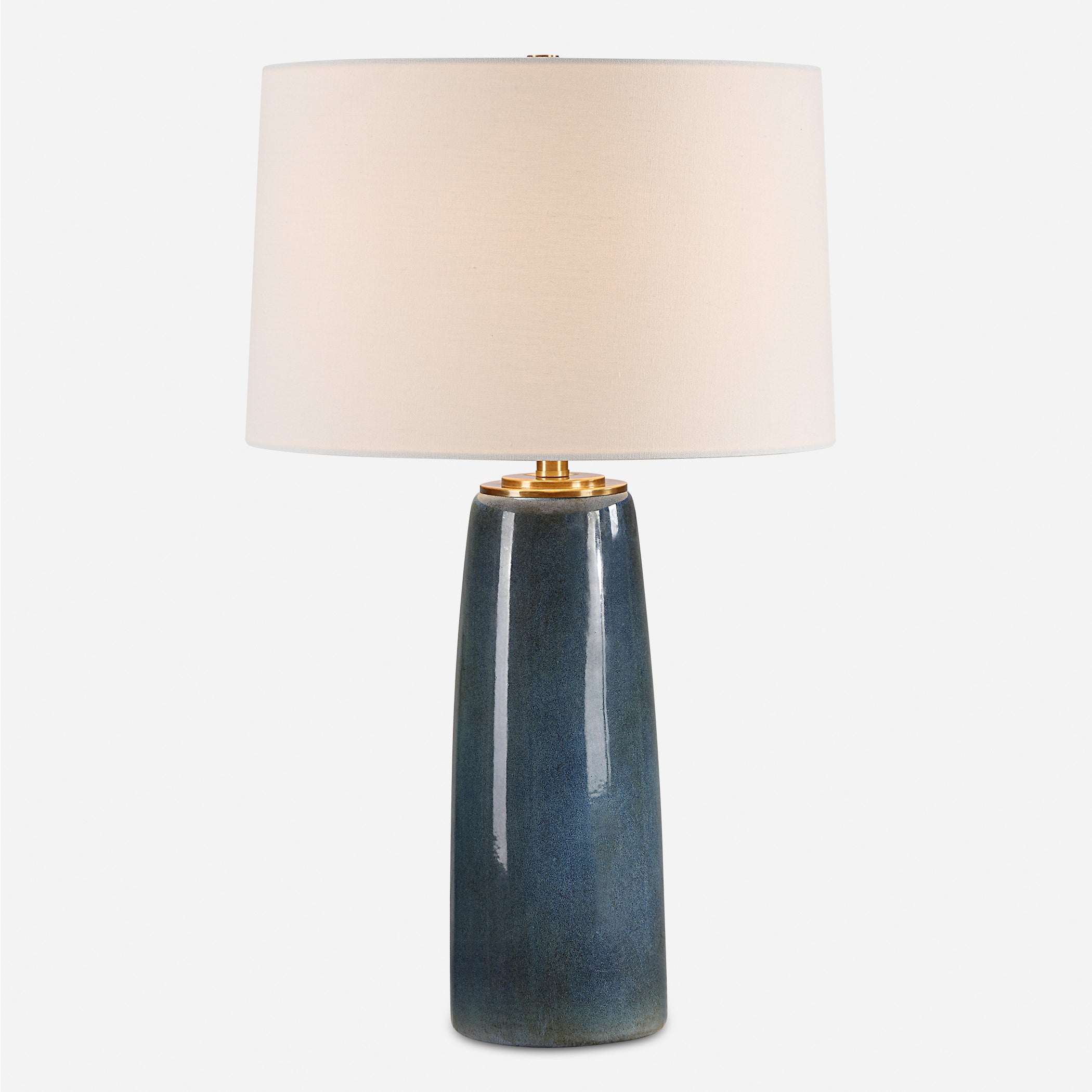 The Submerged Deep Blue Ceramic Table Lamp combines rich tones and refined design, featuring a deep blue glaze with rustic undertones for a striking artistic look. Plated antique brass details add a touch of warmth and sophistication, while the slightly tapered round hardback shade in crisp white linen offers a soft contrast. Due to the handcrafted nature of ceramic glazes, each lamp boasts unique variations in finish, making it a one-of-a-kind accent for your living room, bedroom, or study.