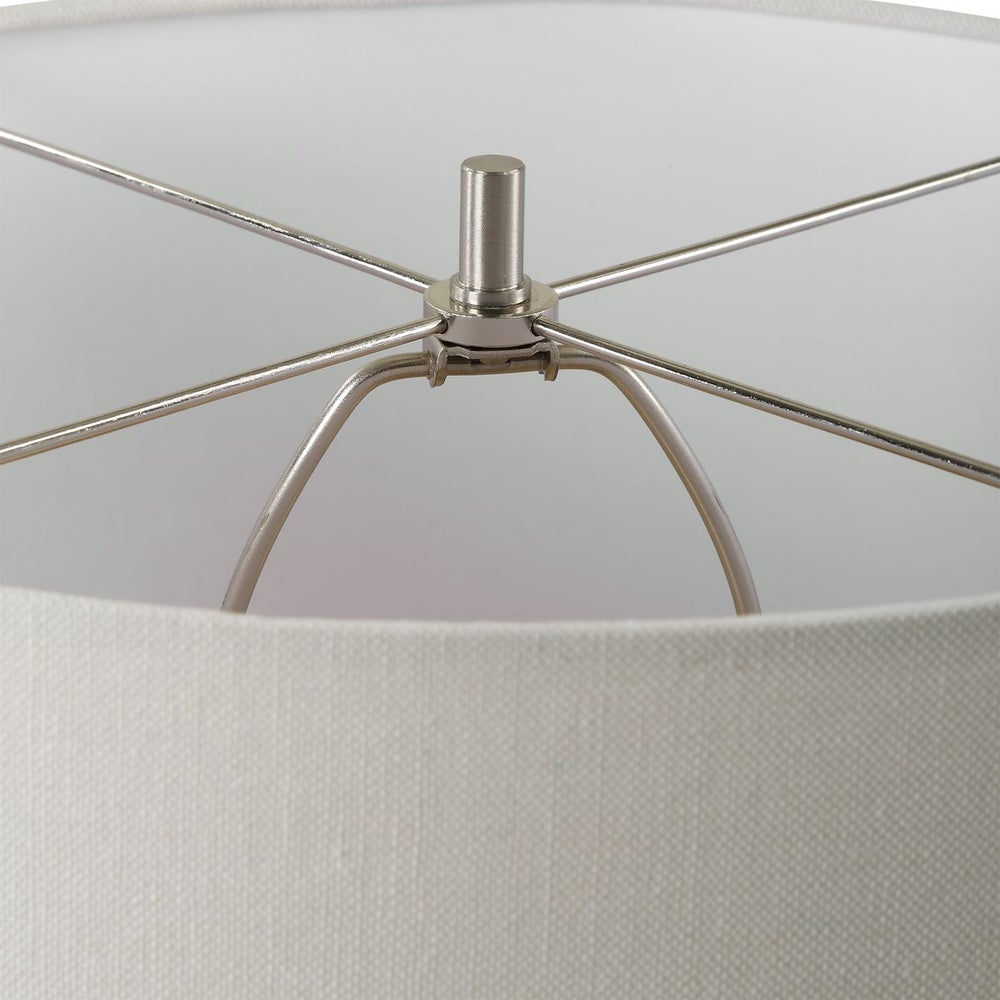 The Haven White Glaze Table Lamp strikes the perfect balance between timeless elegance and rustic sophistication. Its ceramic base features a smooth white glaze with subtly ribbed, distressed detailing that adds depth and character. Complemented by brushed plated nickel hardware, this lamp exudes a refined charm suitable for both classic and contemporary interiors. The round hardback drum shade, crafted from casual white linen fabric, softens the overall look while providing warm, ambient lighting.