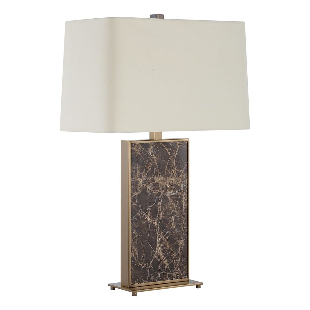 The Lafferty Marble Table Lamp embodies timeless luxury with its Emperador Dark Brown marble slab, encased within a sleek plated brass frame. Complemented by matching metallic accents, this piece seamlessly blends modern sophistication with classic elegance. The slightly tapered rectangular hardback shade, crafted from off-white linen fabric with softly curved corners, diffuses light beautifully to create a warm and inviting glow. Perfect for living rooms, bedrooms, or offices, this lamp serves as both a functional lighting solution and a refined decorative statement.