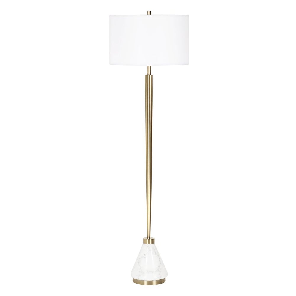 Bring timeless elegance into your living space with the Curran Floor Lamp. This striking piece features a gracefully tapered metal body finished in luxurious plated brass, lending a refined glow to its slender profile. Grounded by a solid, thick-cut white marble base, it blends modern poise with classic stability.