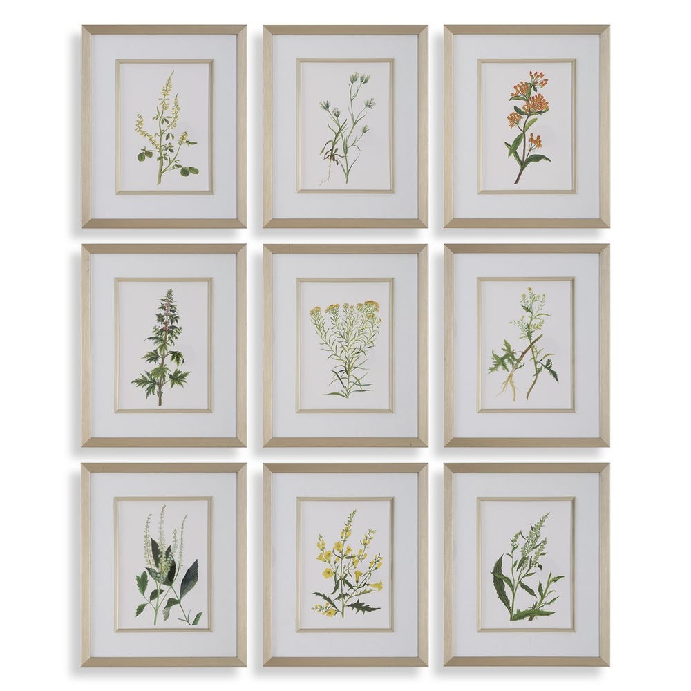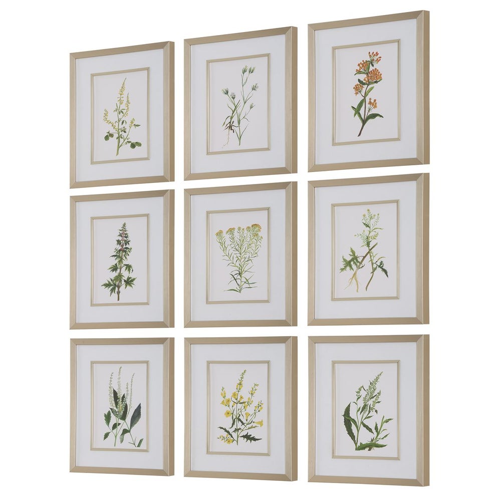 Uttermost 32339 Botanical Flowers Framed Prints Set of 9 in Champagne Frames with Linen Mats
