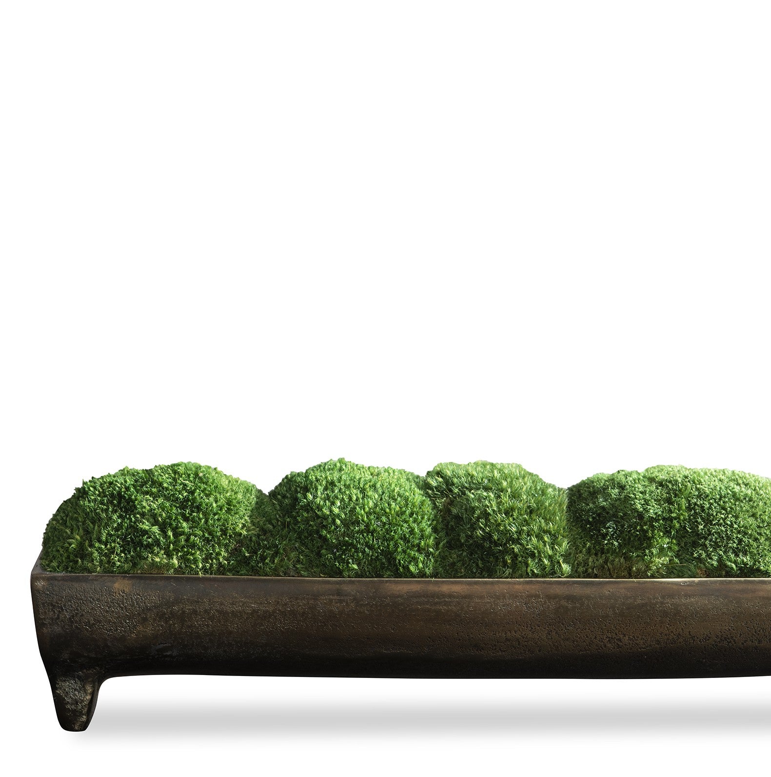 The Canal Moss Small Centerpiece brings a lush, organic element into your interior décor with refined modernity. Featuring perfectly preserved green moss mounds, this composition is housed in an elongated footed tray crafted from durable metal and finished in a beautifully oxidized bronze with multitone patina.