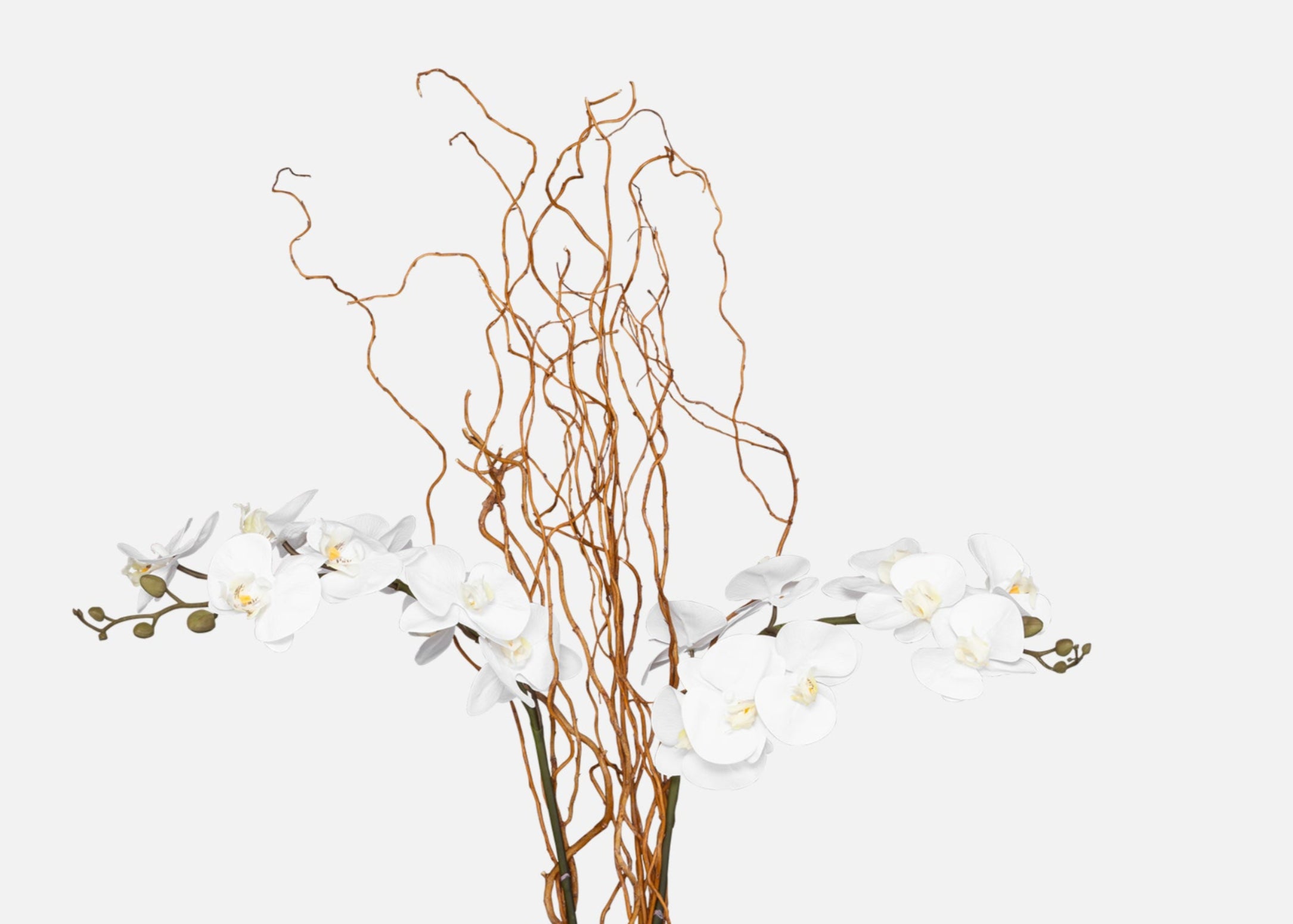 • Natural Textures: Features crisp white orchids with natural curly willow and mushroom accents.