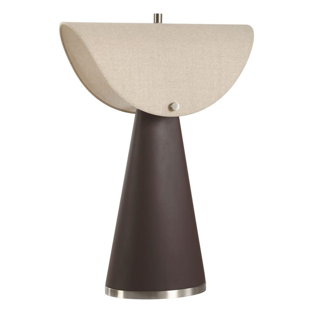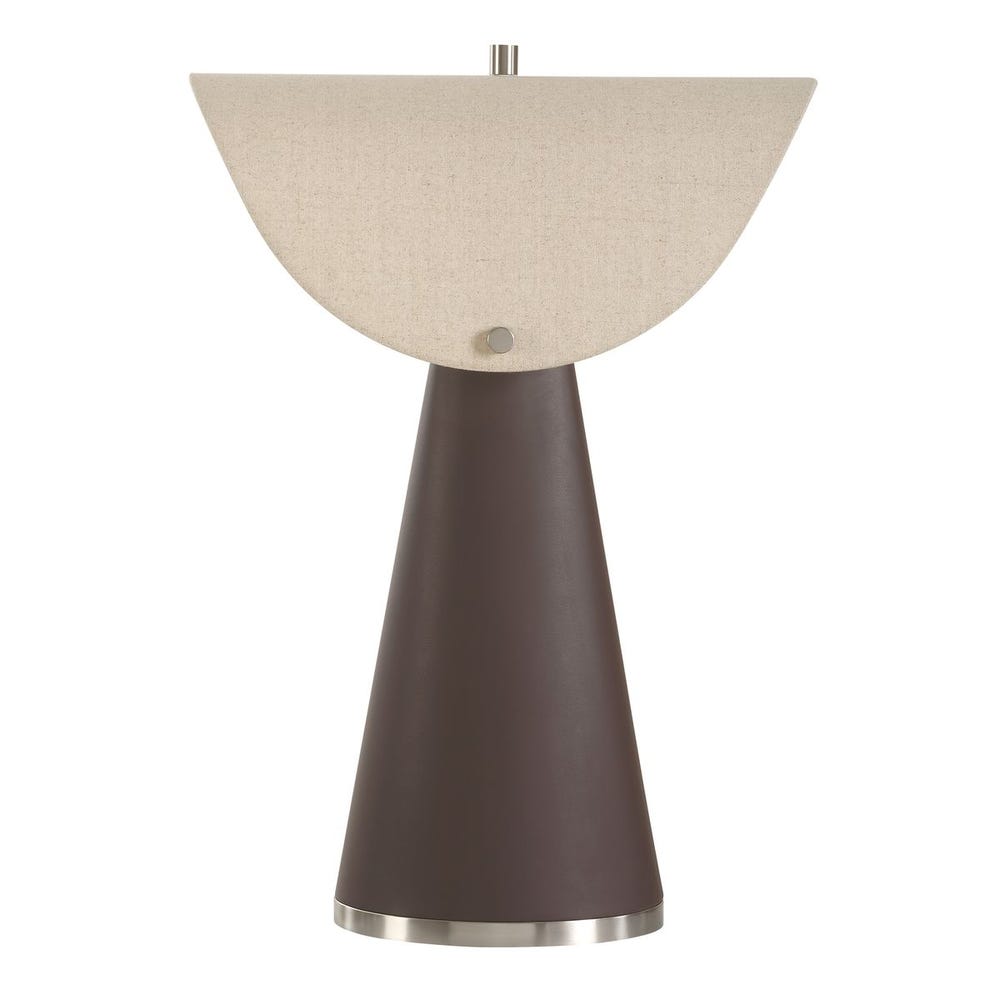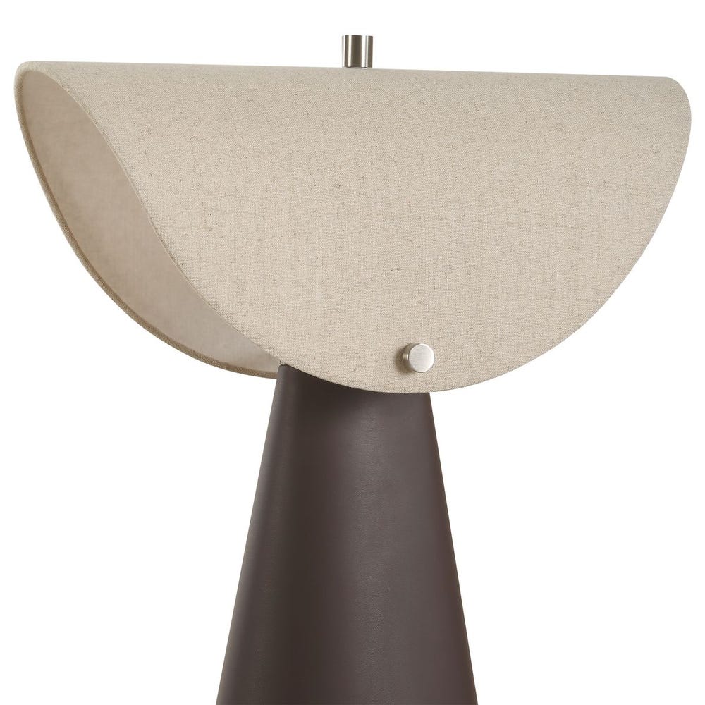 The Uttermost Conover Table Lamp blends rich texture with clean design, featuring a tapered faux leather base in a deep chocolate brown for a warm, contemporary appeal. Sleek plated metal accents add a subtle hint of polish, enhancing its modern aesthetic. The standout feature is a folded white linen shade, concealing dual E26 sockets for layered illumination. Measuring 27 inches in height, with a 9-inch tall shade, this lamp is perfect for nightstands, end tables, or office desks. Elegant yet functional, the Conover lamp delivers both style and performance in any transitional or modern space.