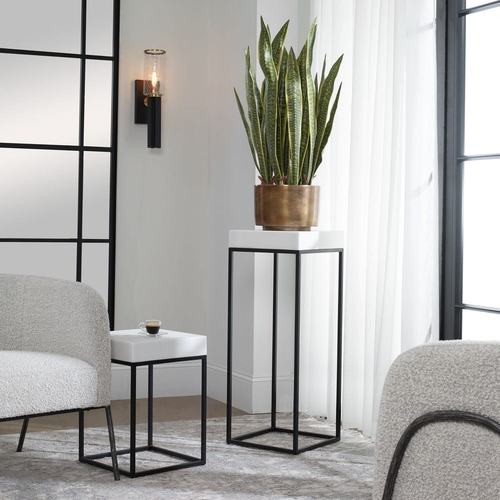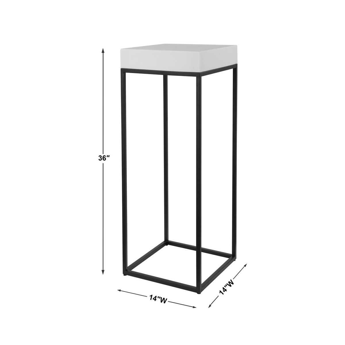 The Uttermost Gambia Marble Plant Stand brings elevated style to your greenery with a striking blend of modern elegance and minimalist design. Designed by David Frisch, this 36" tall stand features a sleek white marble-look top crafted from high-quality resin, resting on a clean-lined steel base finished in aged black. The compact 14" x 14" profile makes it an ideal accent for corners, entryways, or beside furniture where vertical decor makes a bold statement. Crafted in China with premium materials, it's perfect for showcasing plants, sculptures, or decorative objects in modern, industrial, or transitional interiors.