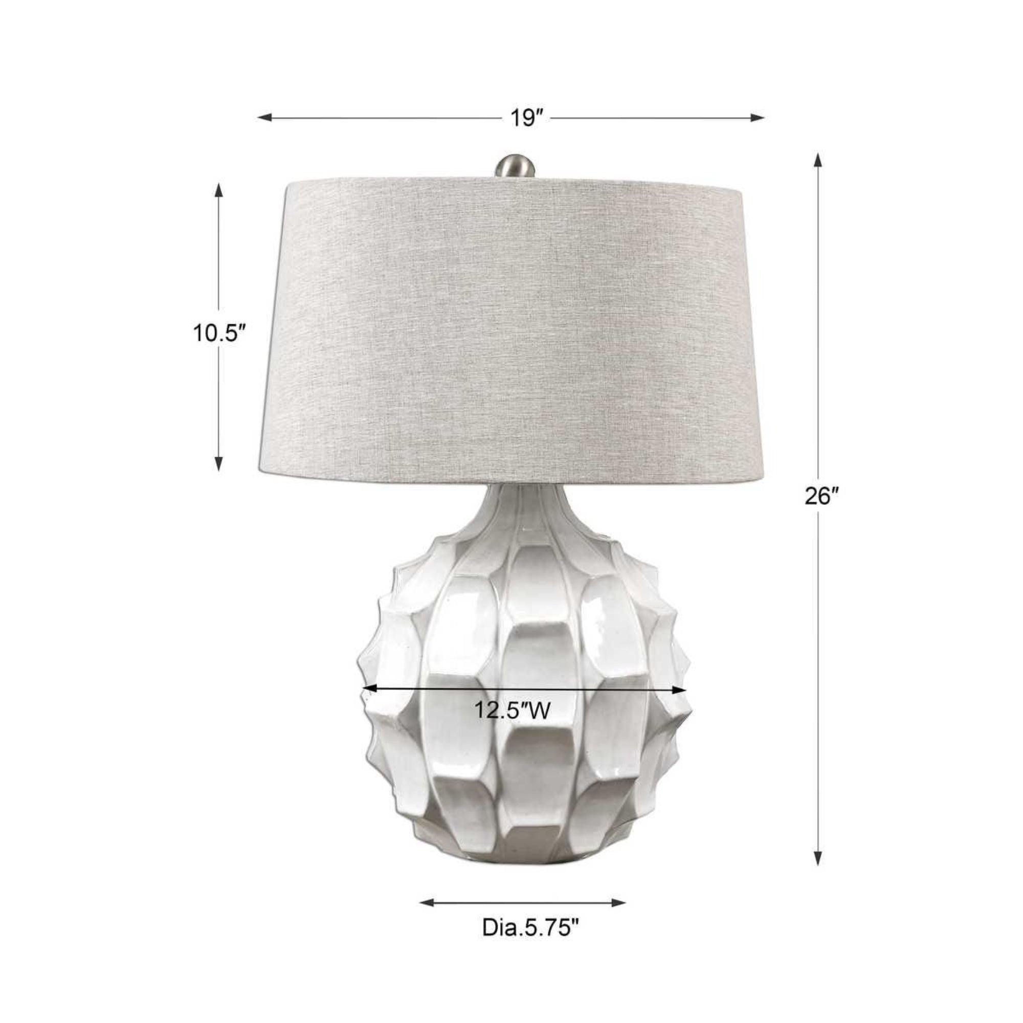 Bring soft elegance to your home with the Guerina Table Lamp, featuring a scalloped ceramic base in a lightly distressed gloss white glaze. Subtle variations in the fired ceramic finish add handcrafted charm, while brushed nickel accents lend a refined contrast. Topped with a slightly tapered hardback drum shade in taupe-gray linen, this lamp adds a serene glow to bedsides, consoles, or living spaces.