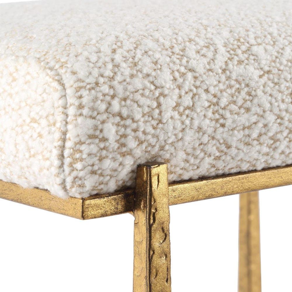 The stool features a textured antique gold iron base that is durable and visually striking, providing sturdy support while enhancing modern interiors. The seat’s polyester blend with a wool-like texture is designed for long-lasting wear and easy maintenance.
