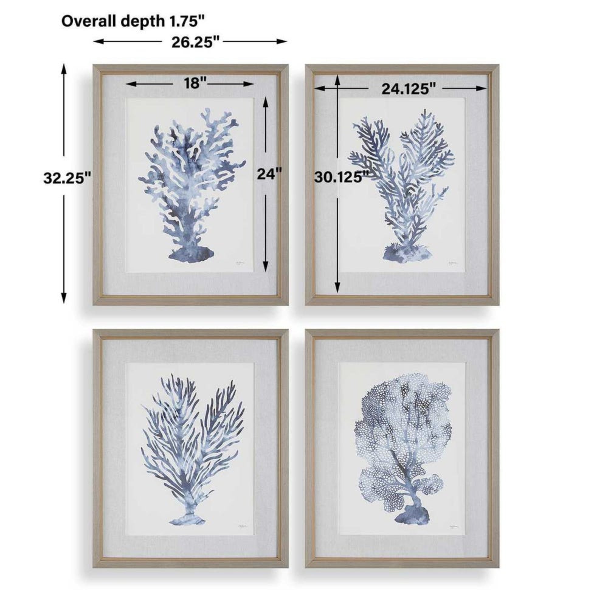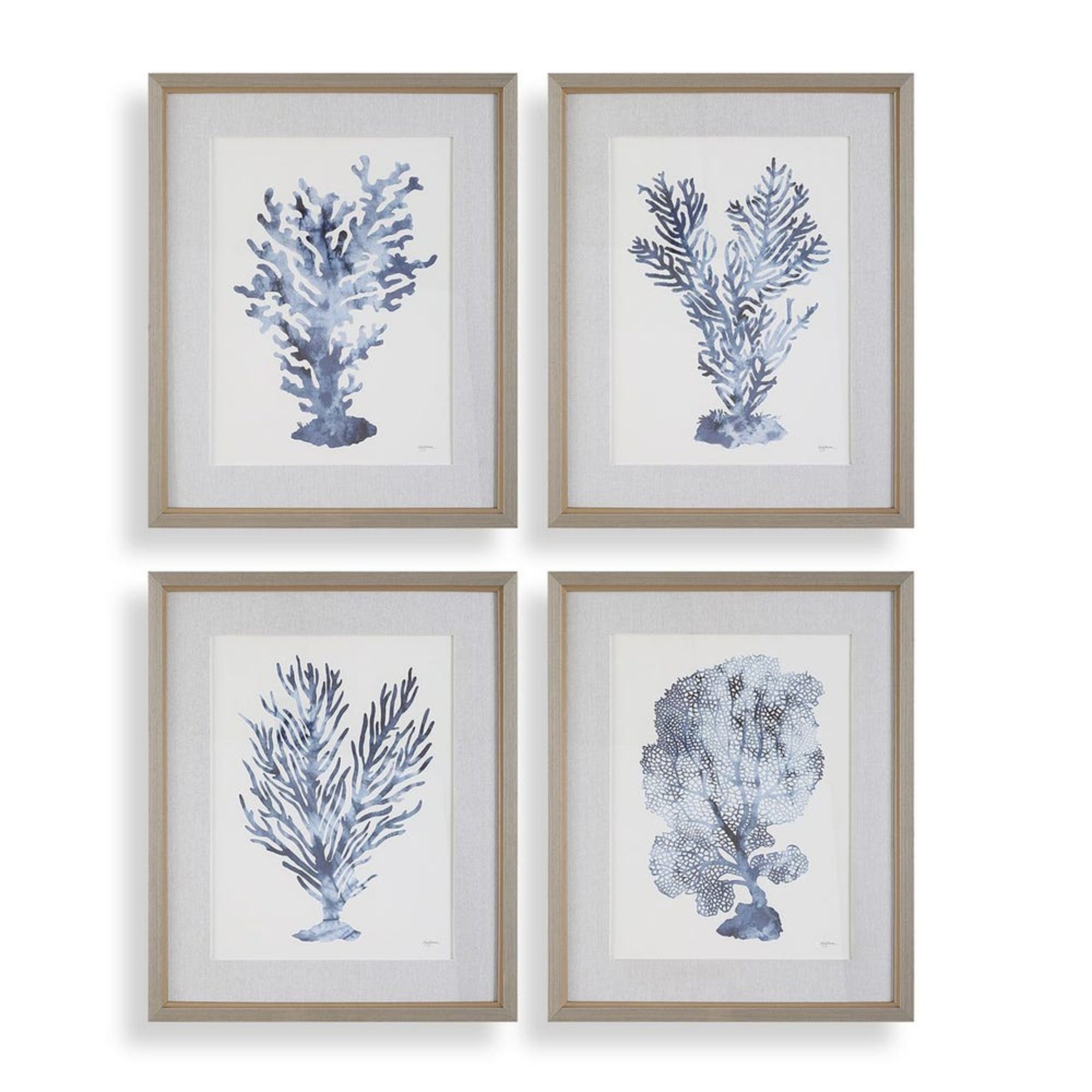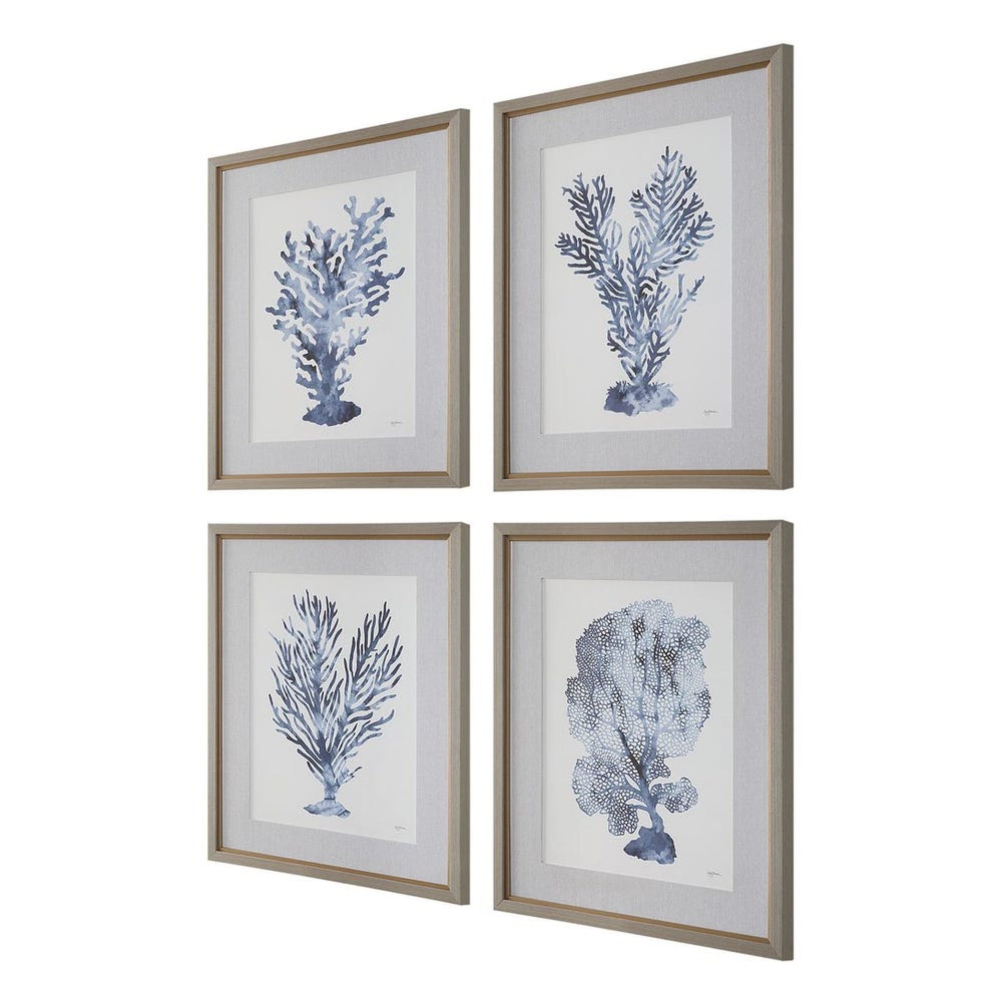 Celebrate coastal refinement with the Shibori Coral Prints, a curated set of four artworks by Mary Urban. These prints capture the delicate intricacy of coral formations in a calming blue monochromatic palette, offering a serene and sophisticated aesthetic. Each print is set against an oatmeal linen-wrapped mat and encased in a light gray wood-toned frame with a petite champagne liner. Finished under protective glass, this set makes a perfect addition to beachside homes or coastal-inspired interiors.