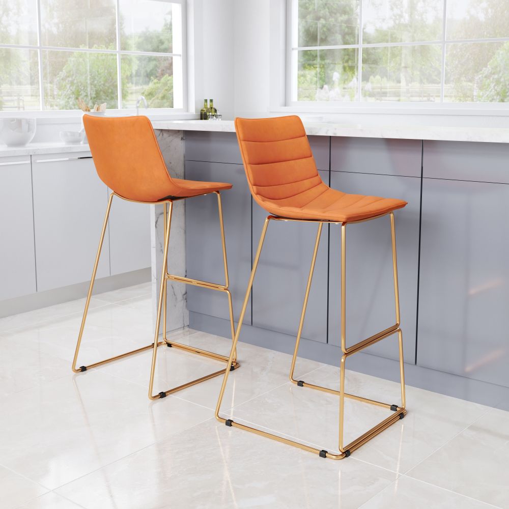 Velvet Barstool 40.2" H, Orange Upholstery and Gold Electroplated Legs by Zuo Modern (Set of 2)
