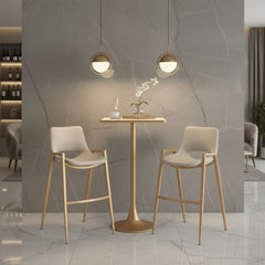 The Adele Barstool by Zuo Modern brings bold elegance and a cheerful vibe to any bar or kitchen space. Upholstered in soft, orange velvet and supported by sleek gold electroplated legs, this barstool is both comfortable and eye-catching. A built-in ergonomic footrest enhances comfort, making it a functional and stylish addition to modern interiors.