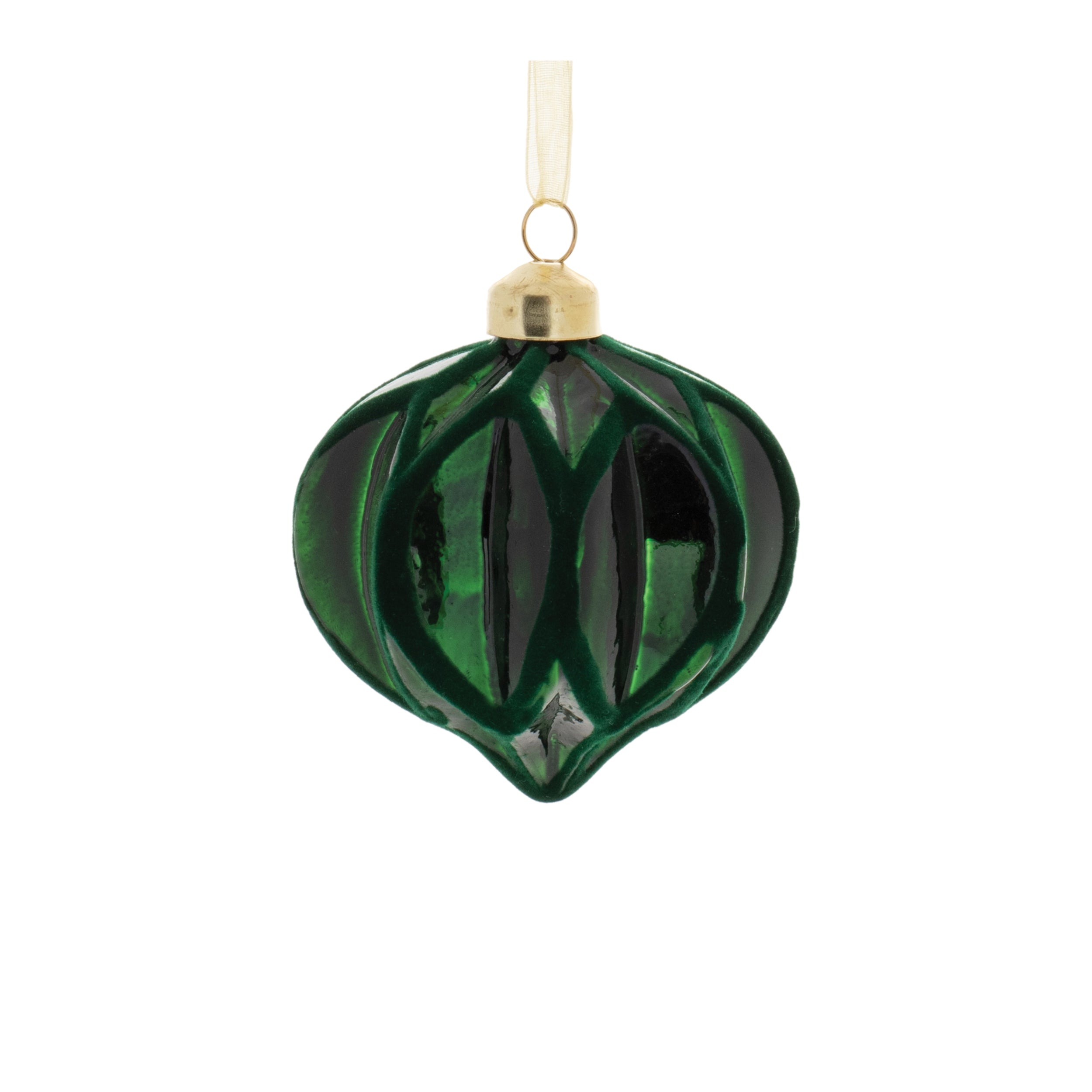 Elevate your holiday décor with this luxurious Velvet Glass Ornament Set. Featuring a deep forest green hue accented with soft velvet details, each ornament showcases three classic shapes—ball, onion, and oblong—enhanced with a geometric ribbed texture. The tallest ornament measures 5 inches high, providing depth and sophistication to Christmas trees, wreaths, or garlands.