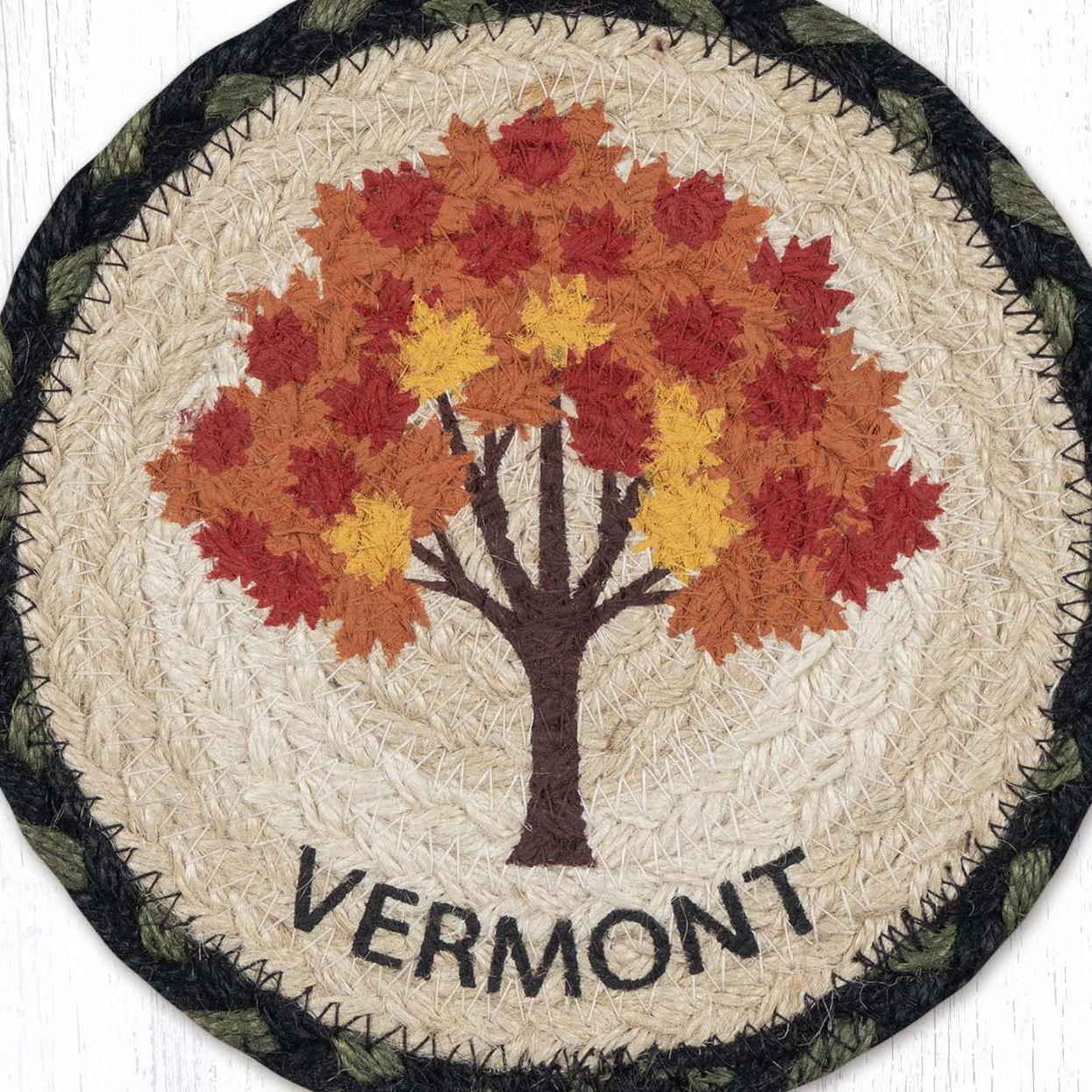 SKU - ER79-116VMTVermont Maple Tree Large Coaster – 7" x 7" Round Braided Jute Hand-Stenciled Coaster