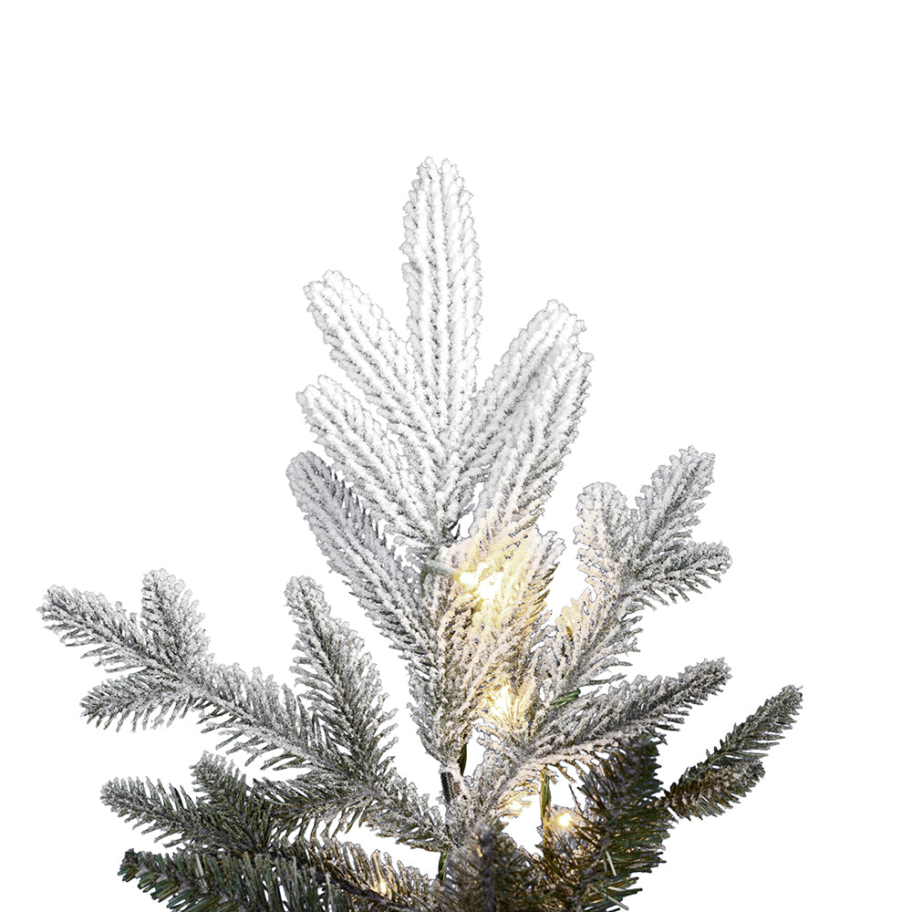 Vickerman 4.5' x 47" Flocked Kamas Fraser Artificial Christmas Tree featuring 750 Warm White Low Voltage 3MM LED Lights and 1599 PE/PVC Tips. This tree has energy efficient Low Voltage LED lights, features a beautiful blend of flocked PE and PVC tips on metal hinged branches and a folding metal tree stand is included.