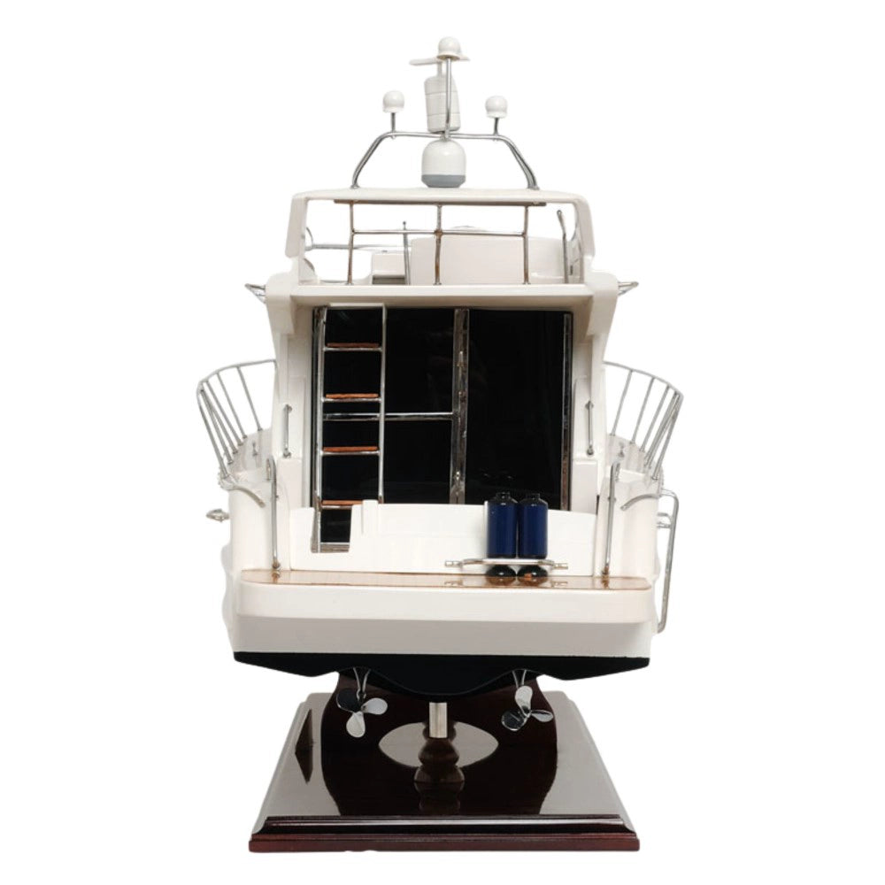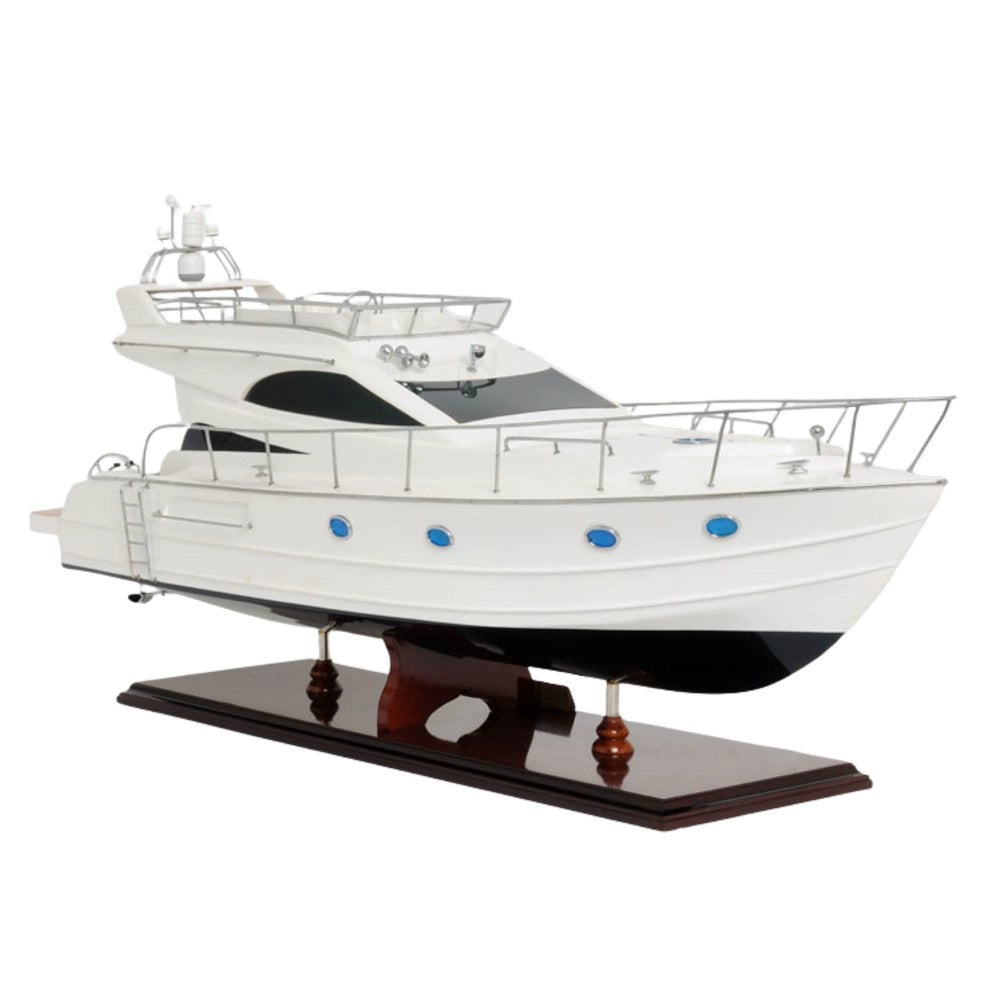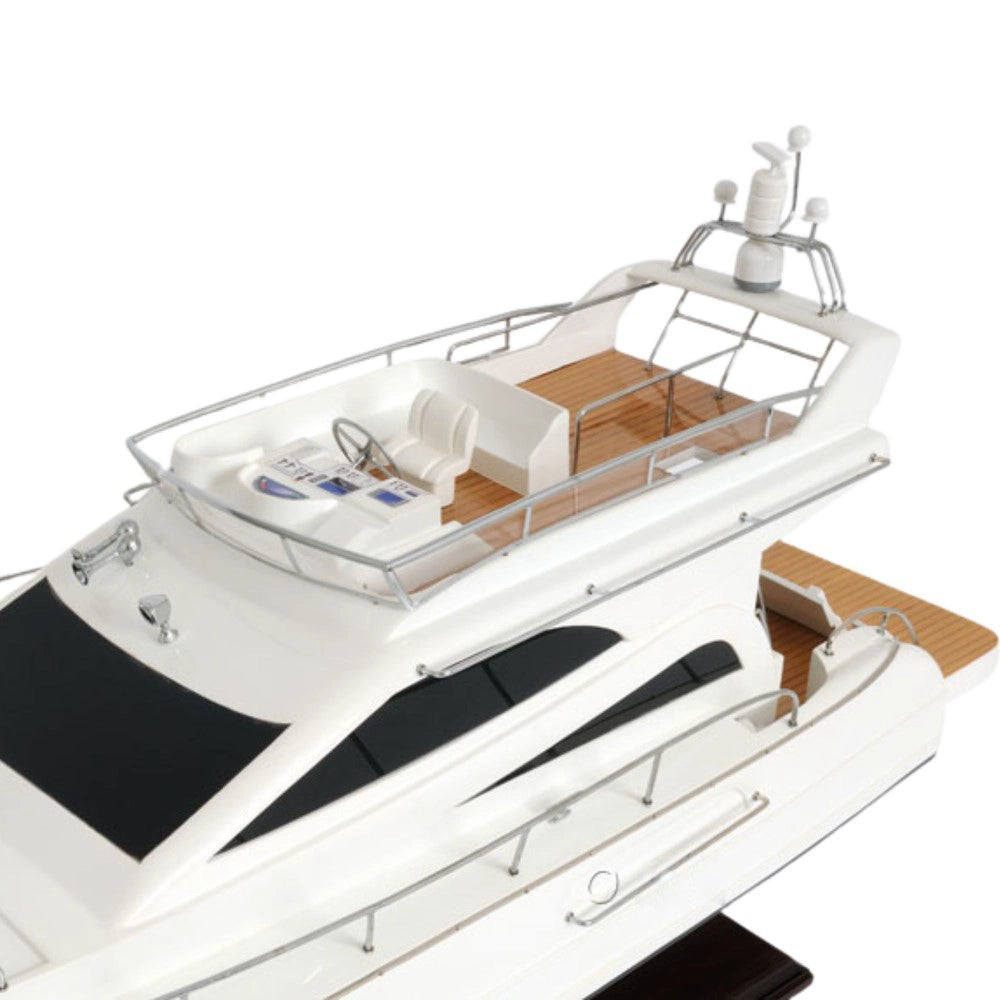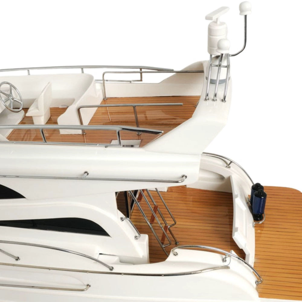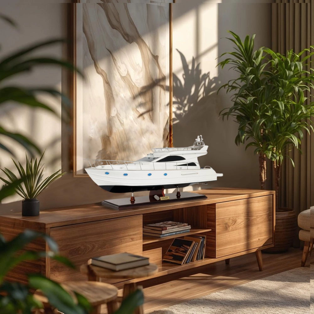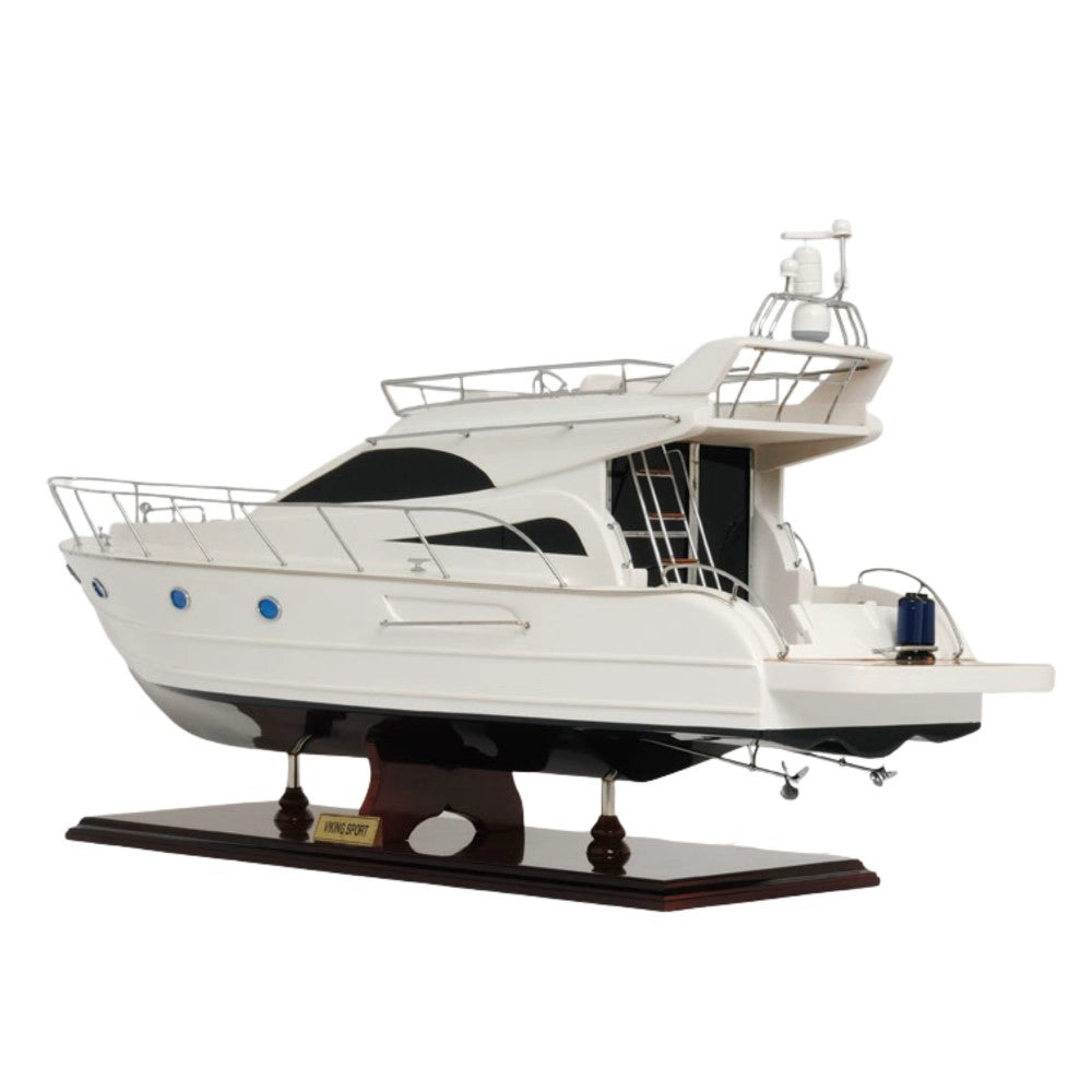 The Viking Sport Cruiser NEW Model Ship is a luxurious 19-inch handcrafted replica made from mahogany, teak, and rosewood. Built using the plank-on-frame technique, this model features a smooth hull painted in antique white with a clear varnish finish. Detailed with metal ladders, tinted windows, oxygen tanks, and a realistic navigation dashboard, it captures the beauty of modern yacht design. Each model rests on a sturdy wooden stand with metal supports and arrives fully assembled for display. Combining precision craftsmanship with elegant aesthetics, this Viking Sport Cruiser model makes a stunning centerpiece for collectors, marine enthusiasts, or nautical decor lovers.