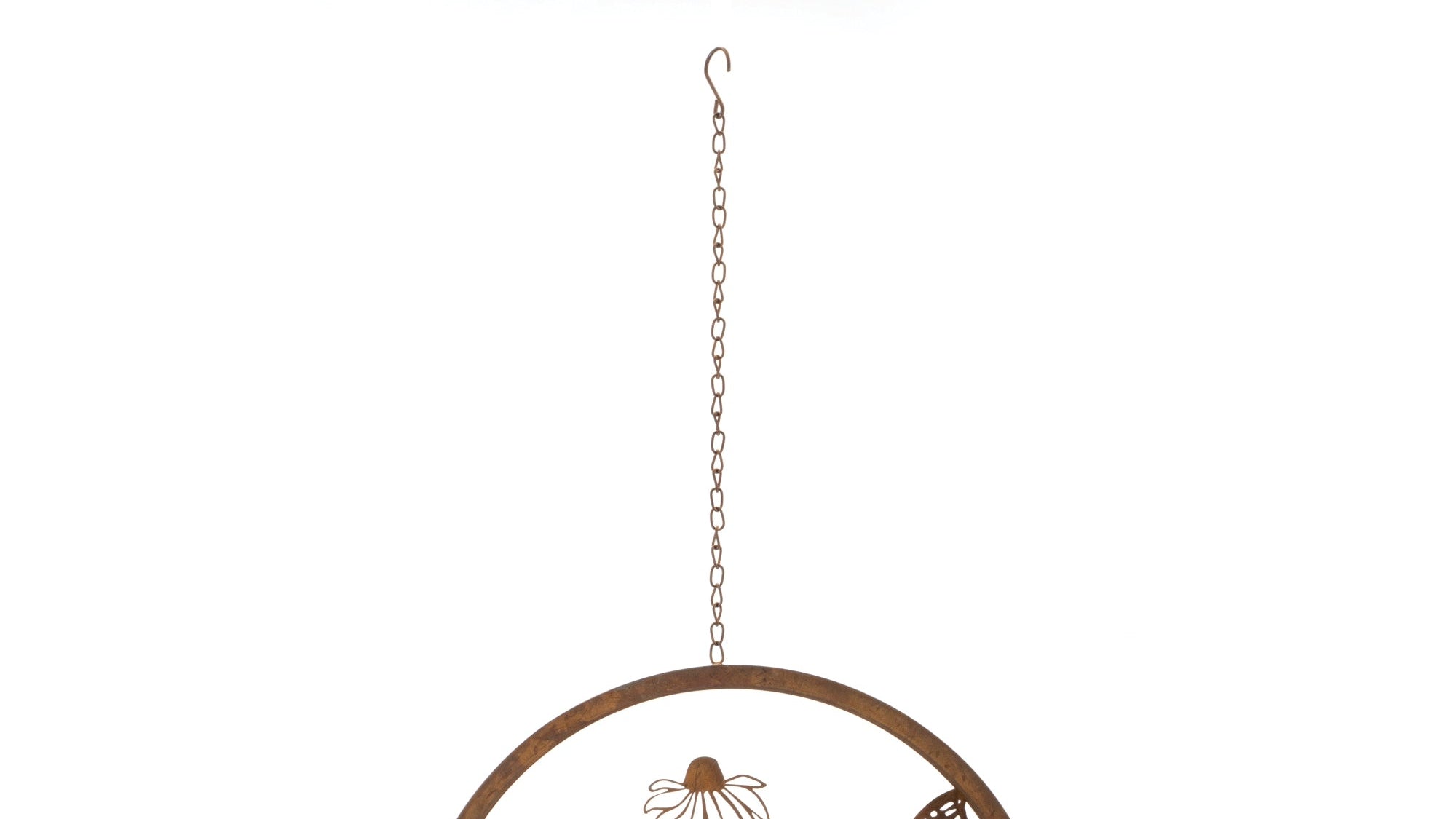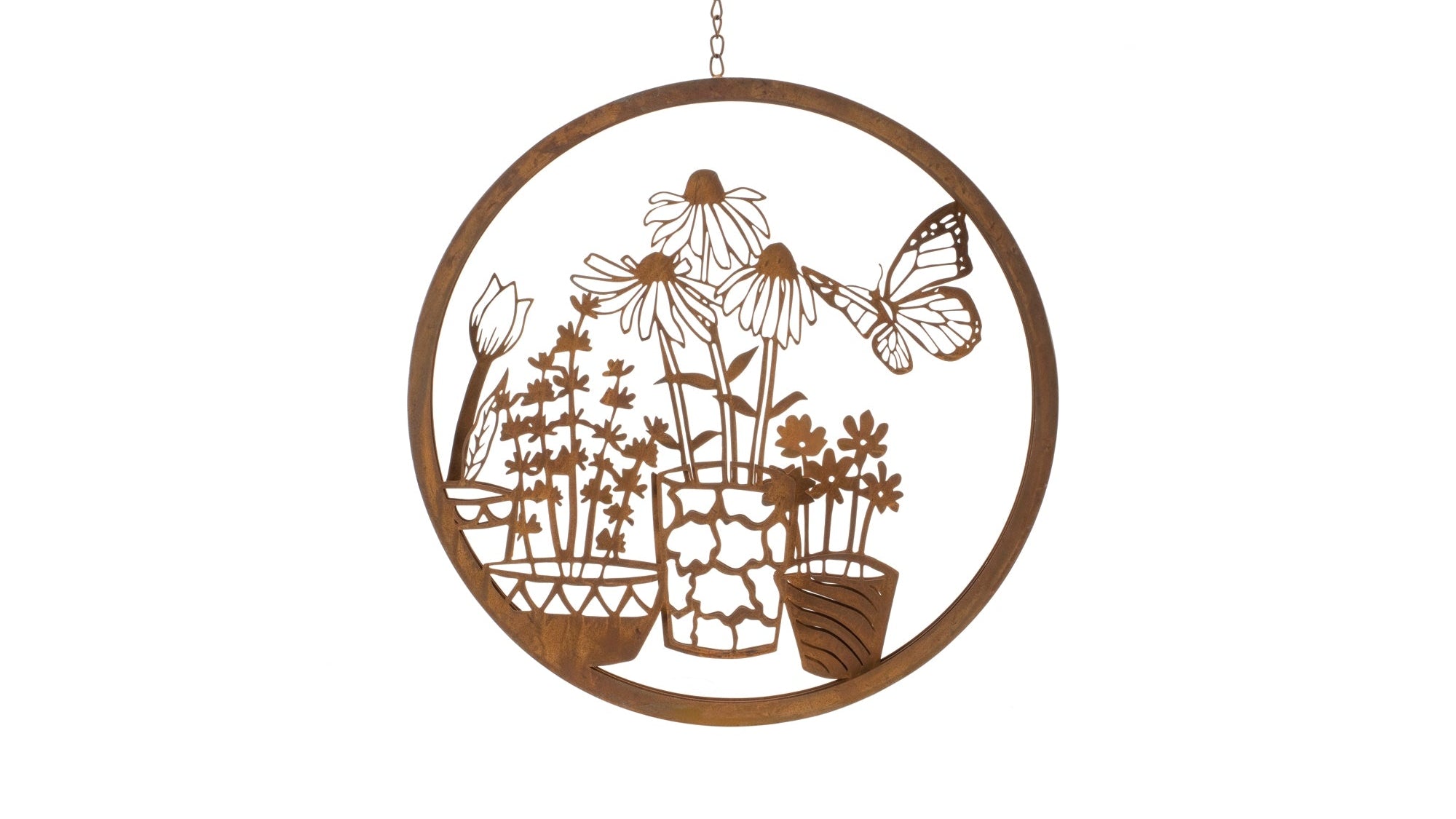 This wall plaque features a layered butterfly floral design crafted from durable iron with a distressed bronze finish. Designed to add depth and visual interest, the cut out metal construction creates a dimensional look suitable for both indoor and outdoor spaces. Ideal for hanging on a porch, fence, patio wall, or interior accent wall, this wall plaque brings a traditional decorative touch to any setting. An attached hanging chain allows for easy installation and flexible placement. Measures 16 inches long x 1 inch wide x 16 inches high, making it a balanced statement piece for garden or home display.