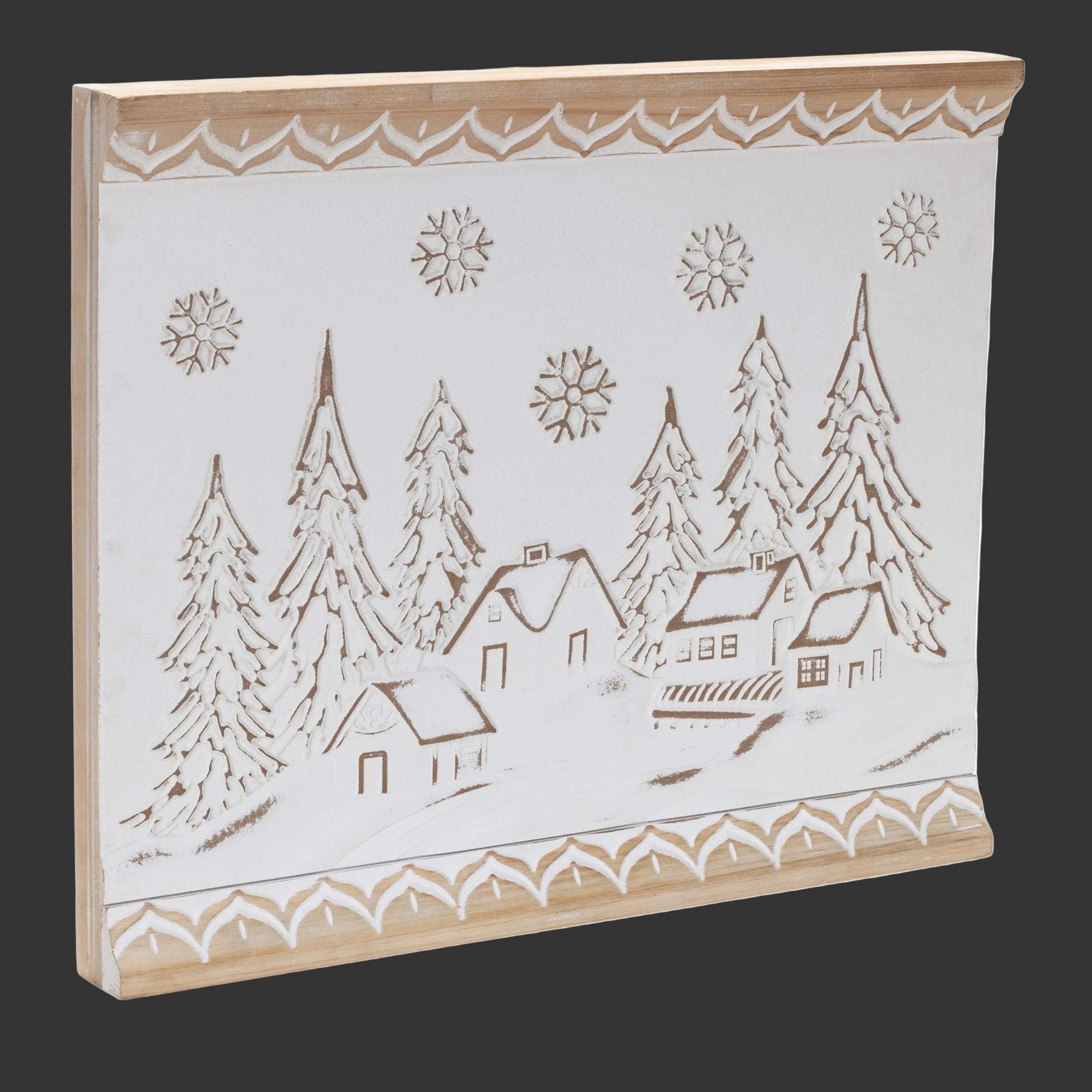 Bring cozy seasonal charm to your home with this Carved Wood Winter Village Wall Art, beautifully crafted from wood and MDF for durability and timeless appeal. Measuring 19" L x 2" W x 15.75" H, this decorative wall piece showcases finely carved snowy trees, gentle snowflakes, and a peaceful winter village scene. Its soft white and beige tones with visible wood grain add rustic warmth, making it a perfect accent for farmhouse and holiday-inspired interiors