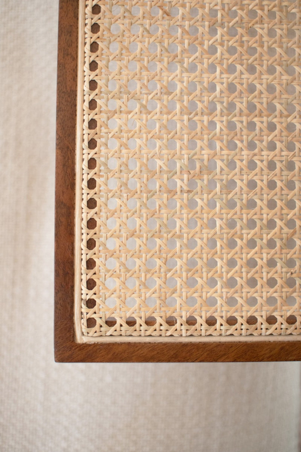 - Handcrafted wood construction with woven cane detailing for natural texture