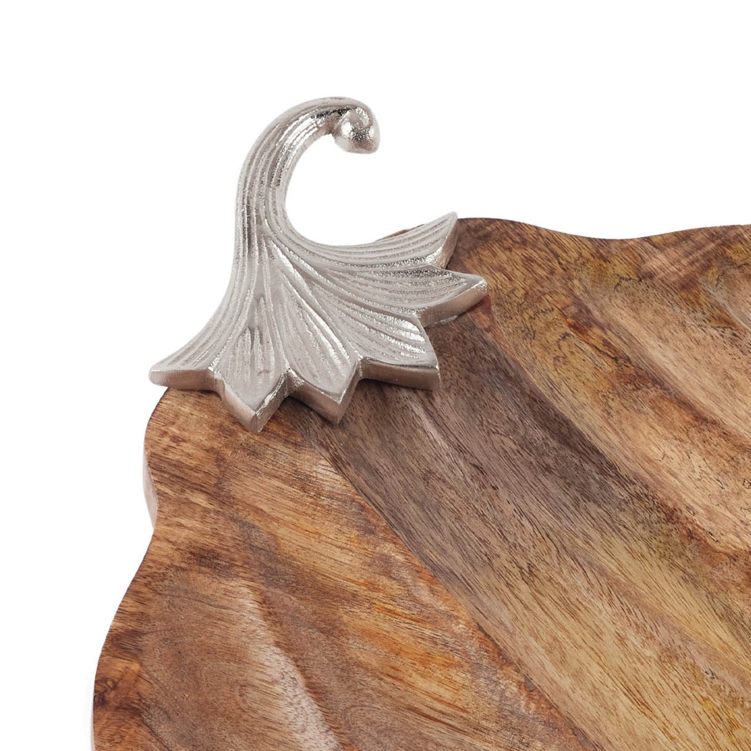 Celebrate fall and Thanksgiving with this Wooden Pumpkin Tray with Aluminum Stem, measuring 15.75"L x 13"W x 1.75"H. Crafted from wood with a natural grain finish and accented with an etched aluminum stem, this tray features a modern carved pumpkin design that adds rustic charm to your holiday décor. Perfect for displaying decorative items like orbs, acorns, or candles on your coffee table or dining table, it creates a warm seasonal centerpiece. Ideal as a thoughtful Thanksgiving gift, this versatile tray enhances any indoor fall décor, blending modern design with cozy, festive elegance for your seasonal celebrations.