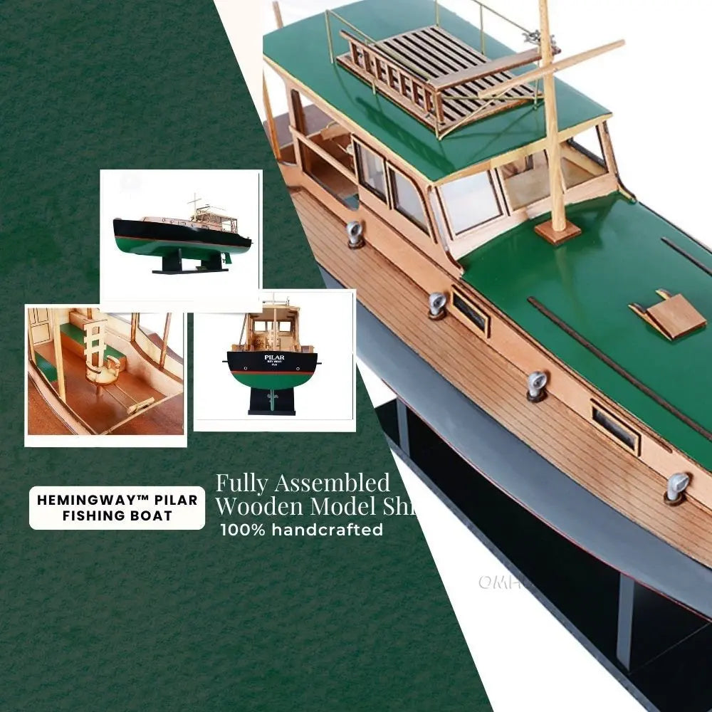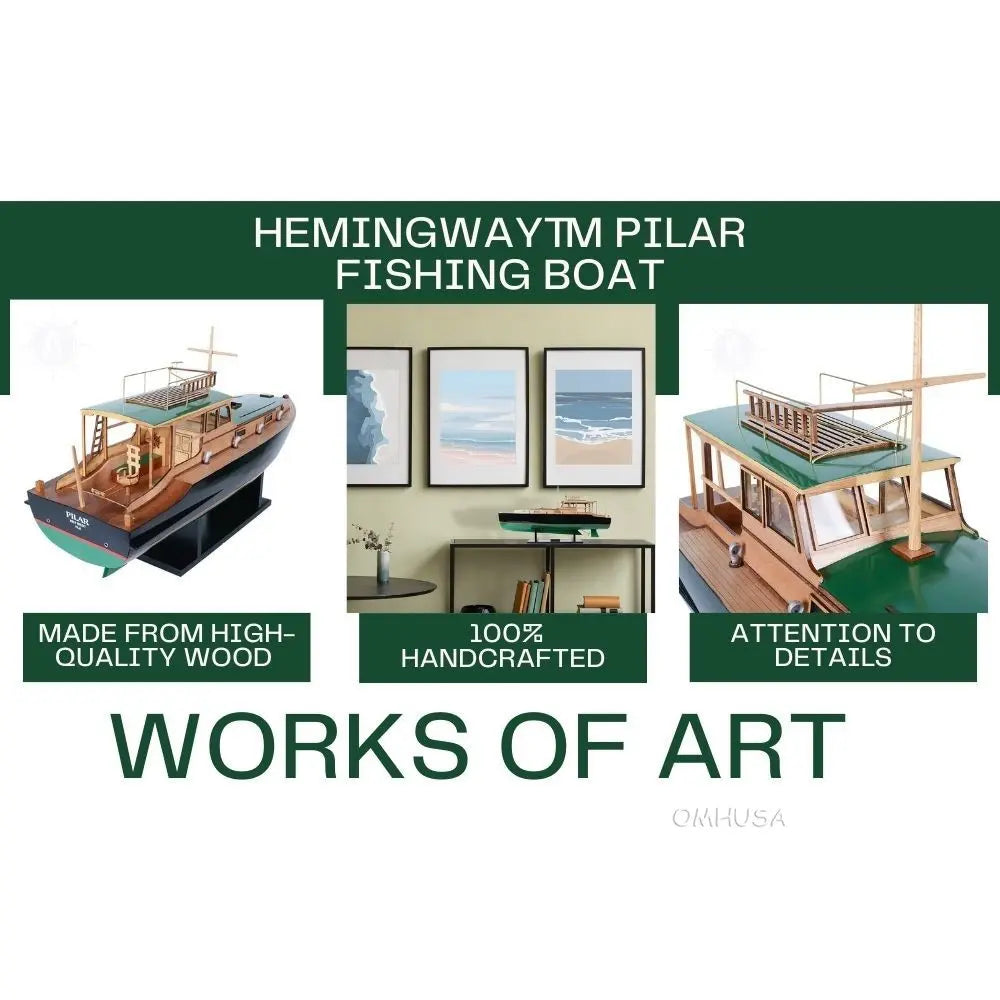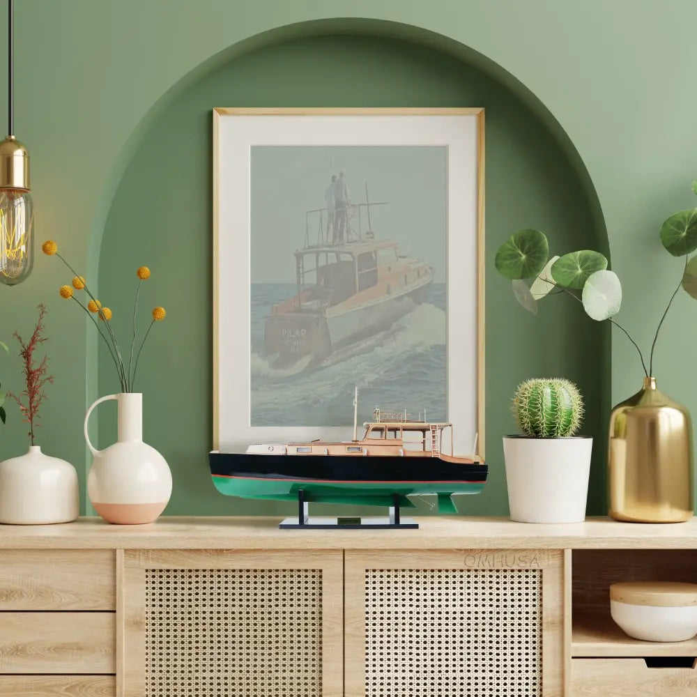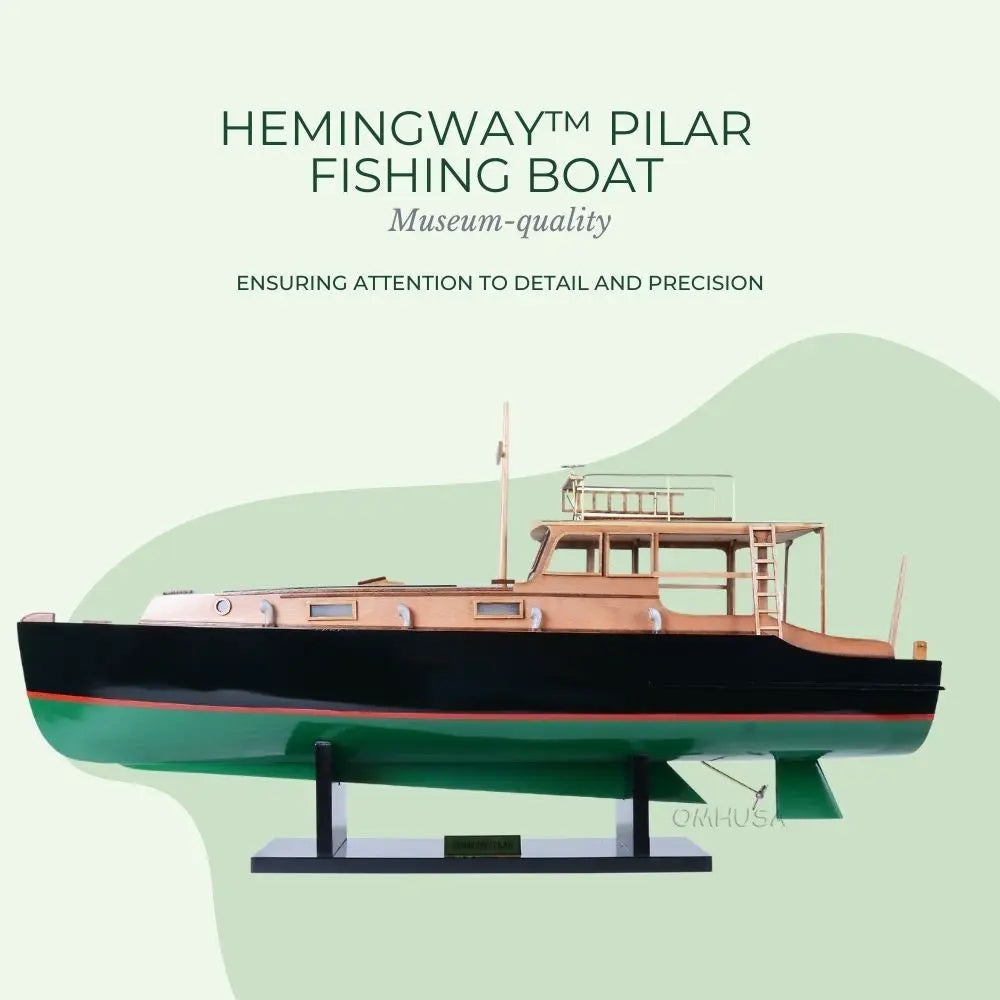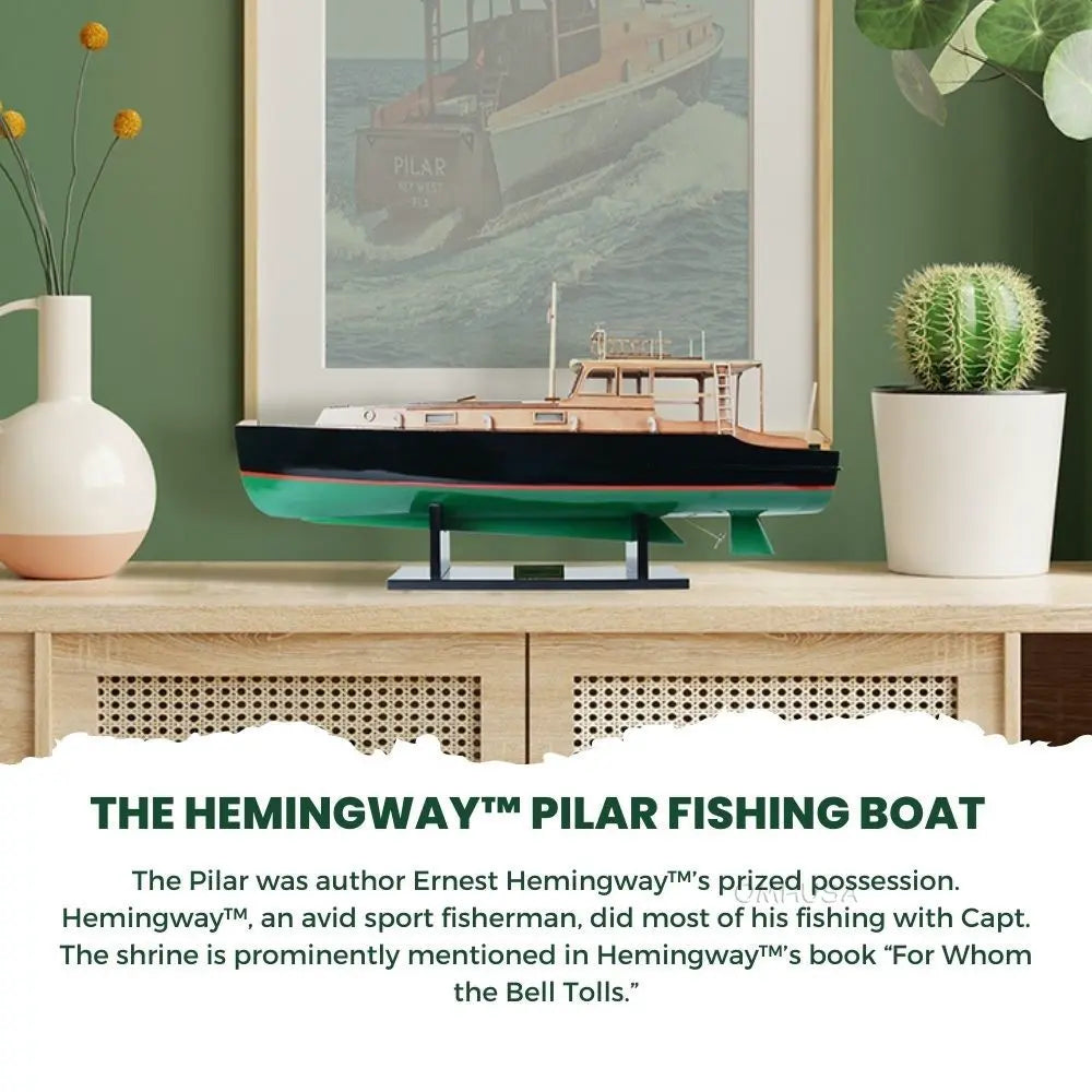 This 27.5-inch handcrafted Hemingway Pilar model is an officially licensed replica of the author’s iconic fishing boat. Built using original plans and painted in its signature green and black finish, the model showcases remarkable detail with metal railings, a steering wheel, wooden chair, and bed. Each element reflects Hemingway’s real-life adventures aboard the Pilar in Cuba and the Gulf Stream. Crafted entirely by hand from high-quality wood, this model sits on a sturdy wooden stand and is ready for display. A centerpiece for collectors and literary fans alike, it represents the spirit of the sea and the legacy of a literary giant.