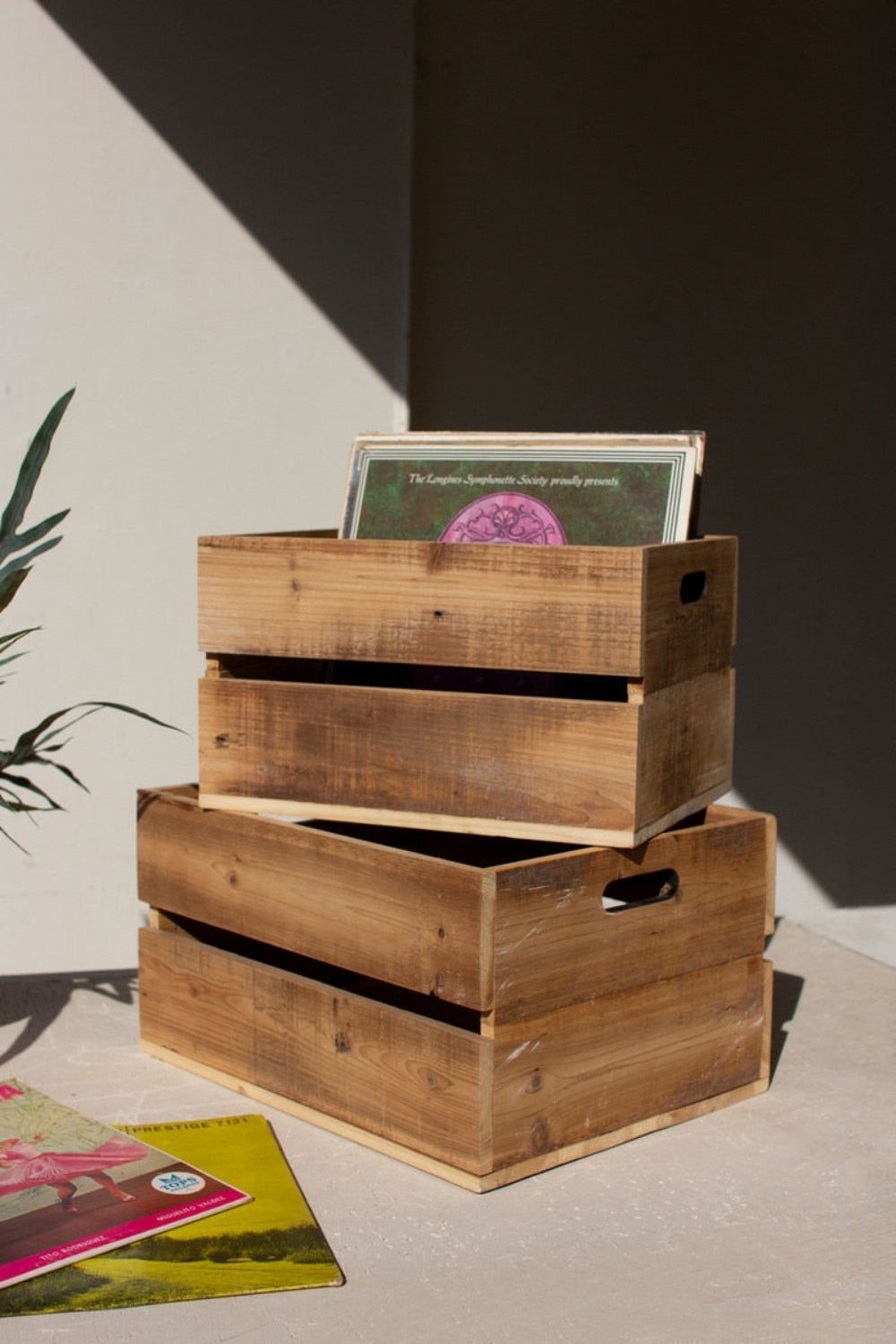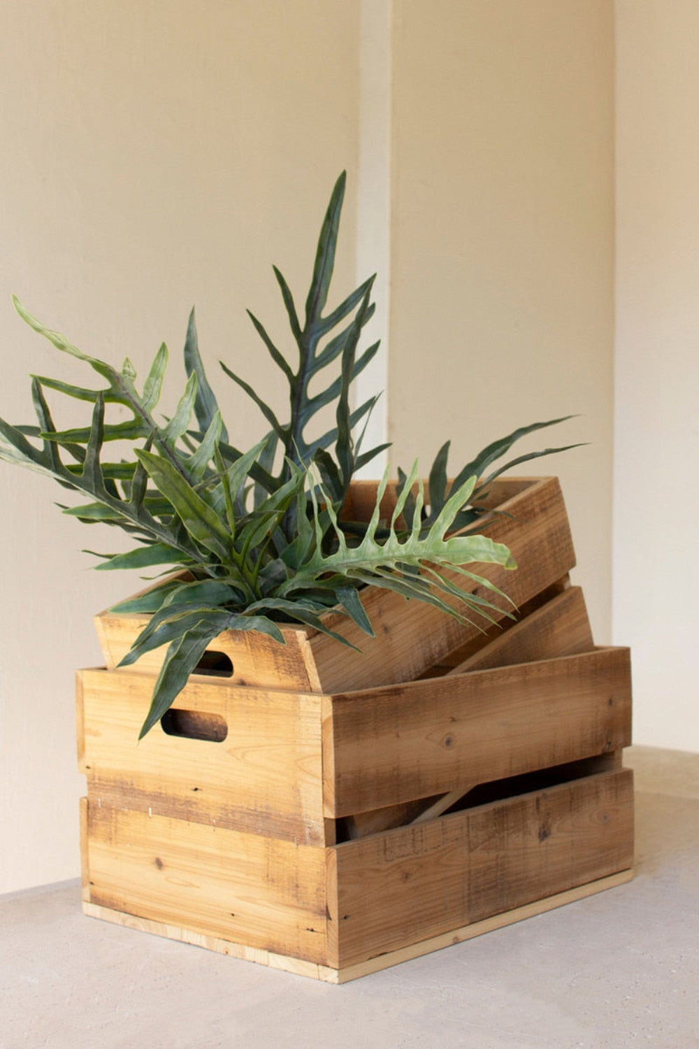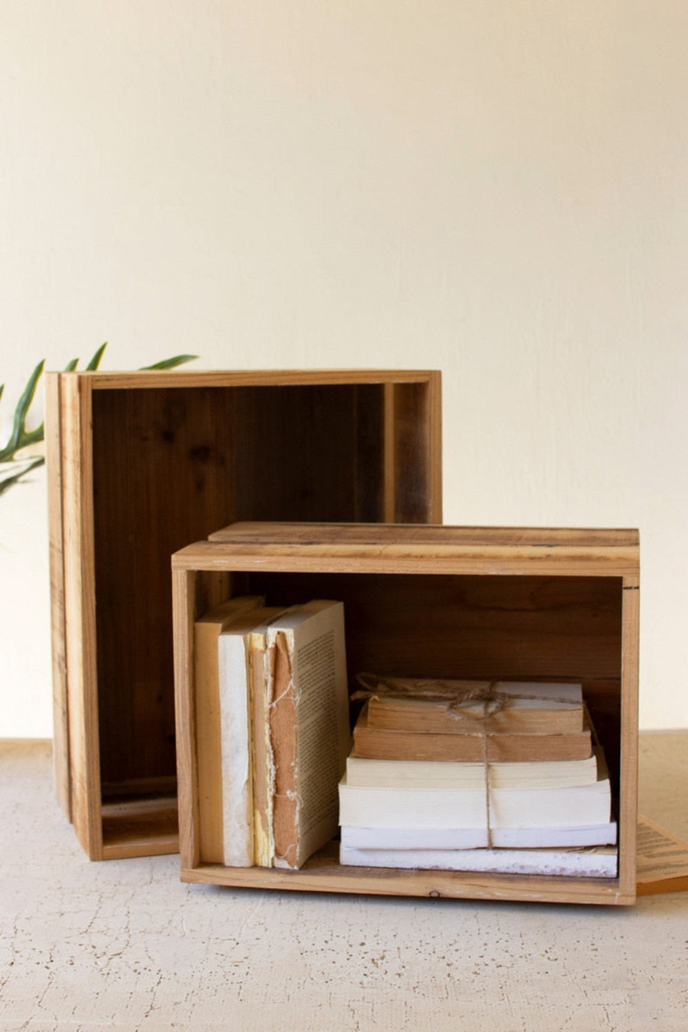 - Set of 2 slatted wooden storage crates
