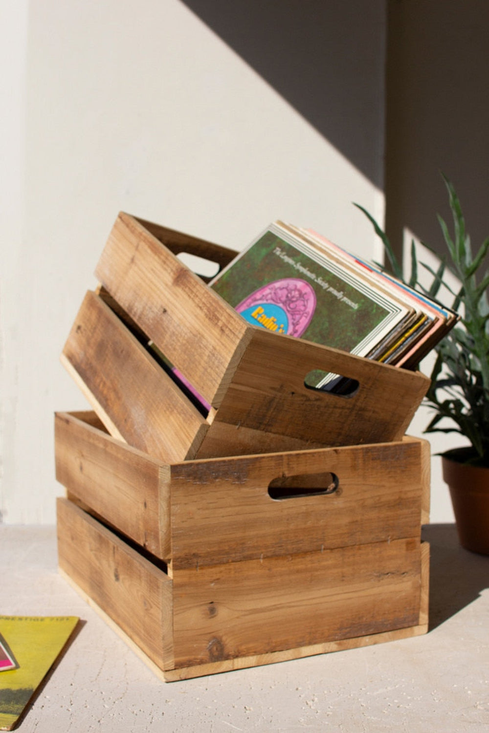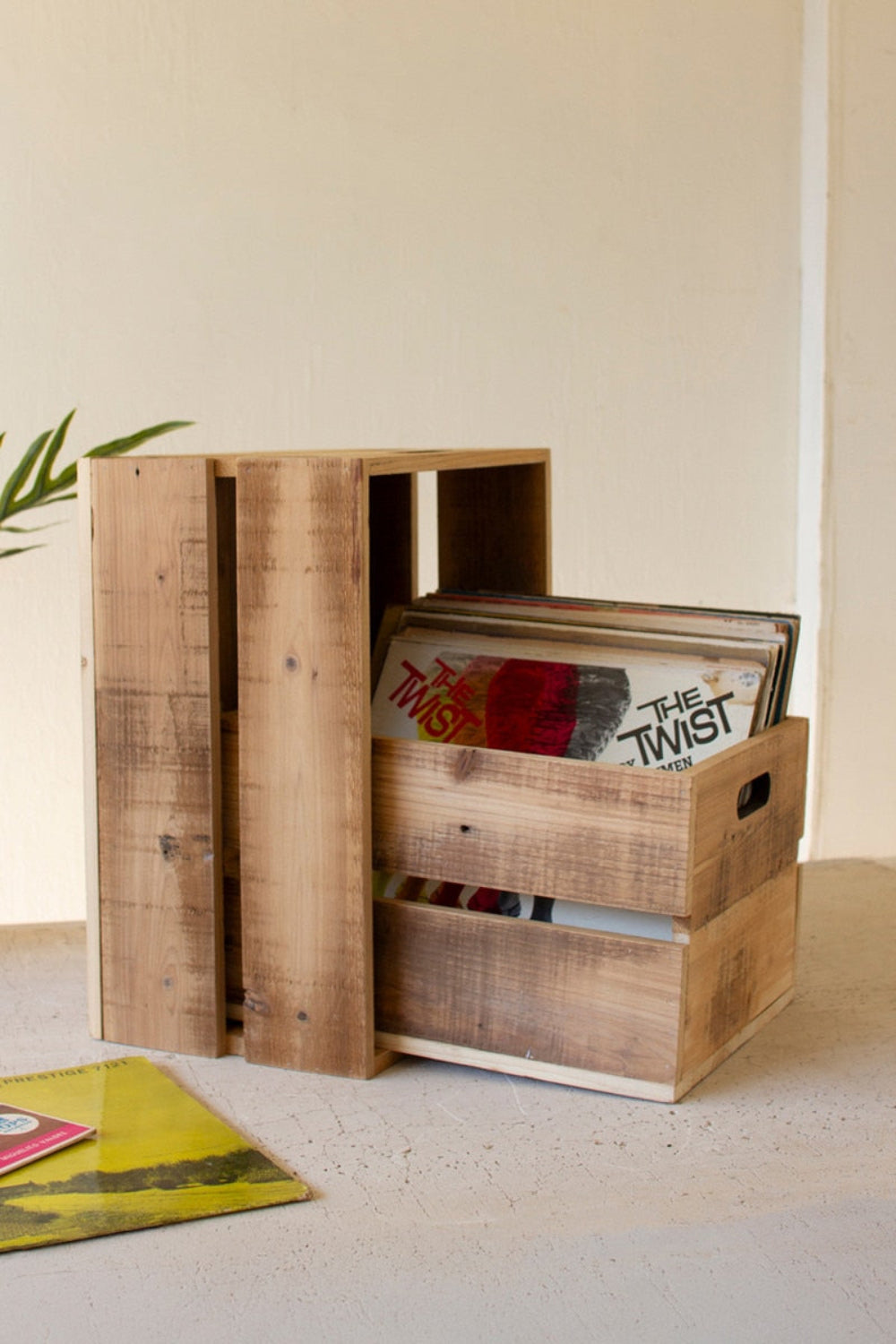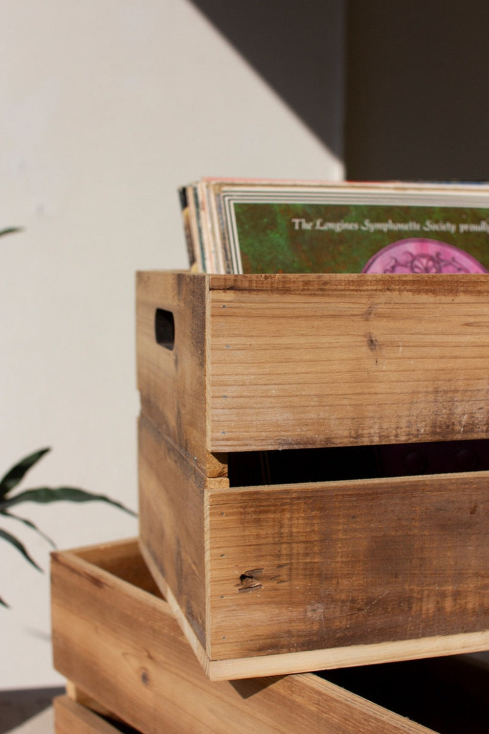 - Set of 2 slatted wooden storage crates