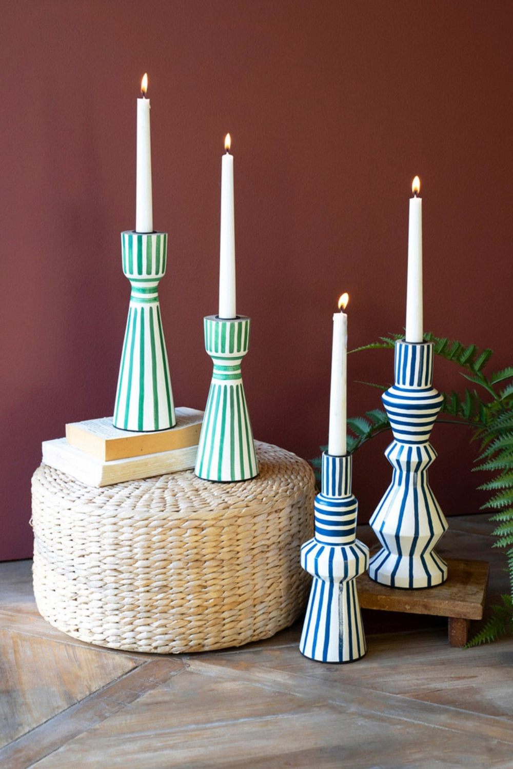 Wooden Taper Candle Holders – Hand Painted Green Stripes – Set of 2 by Kalaou