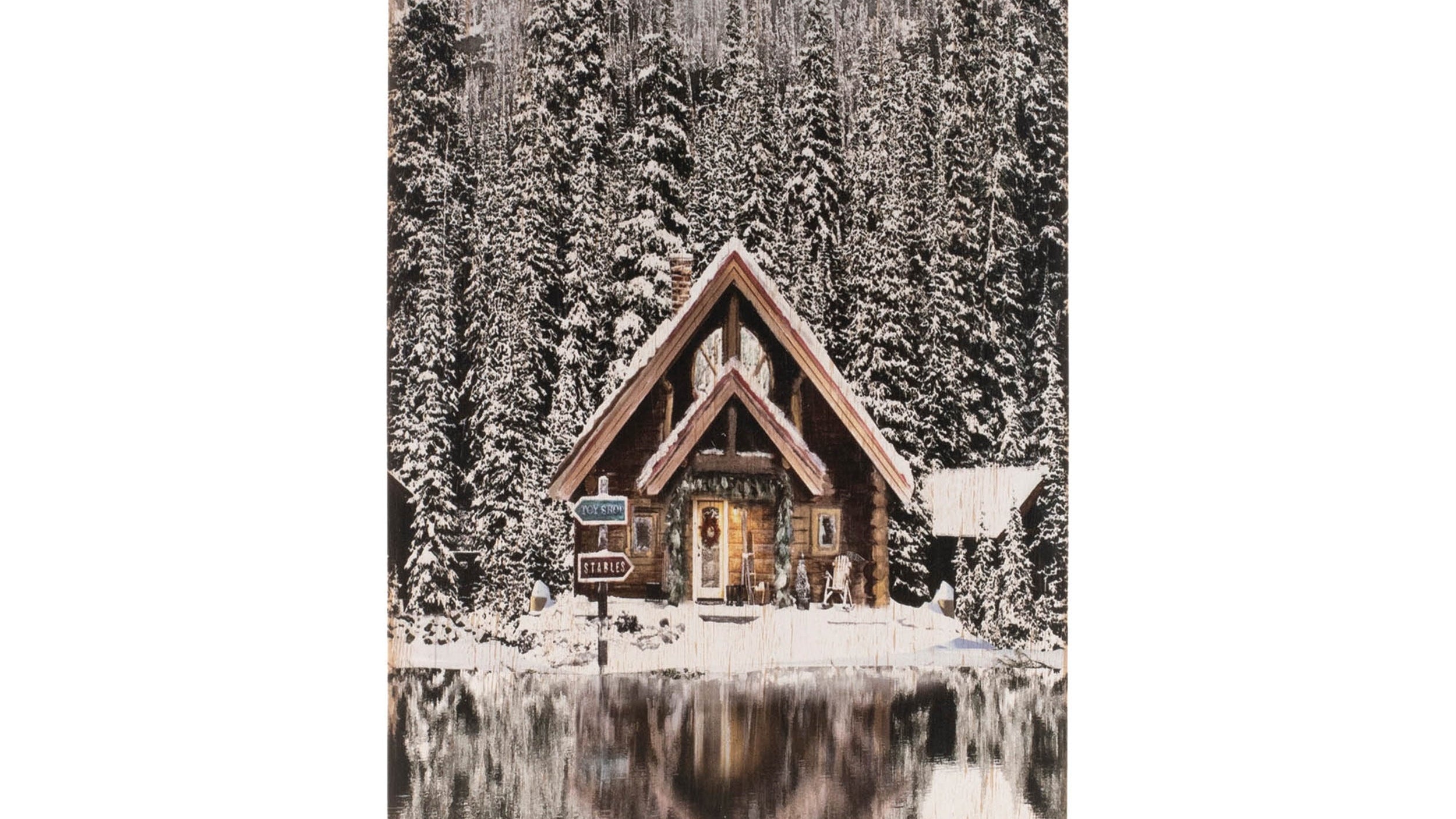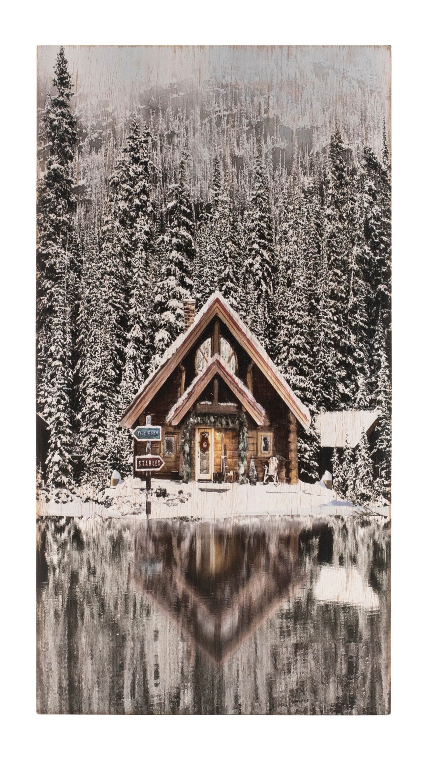 - Wooden wall plaque featuring a winter lodge and lake scene