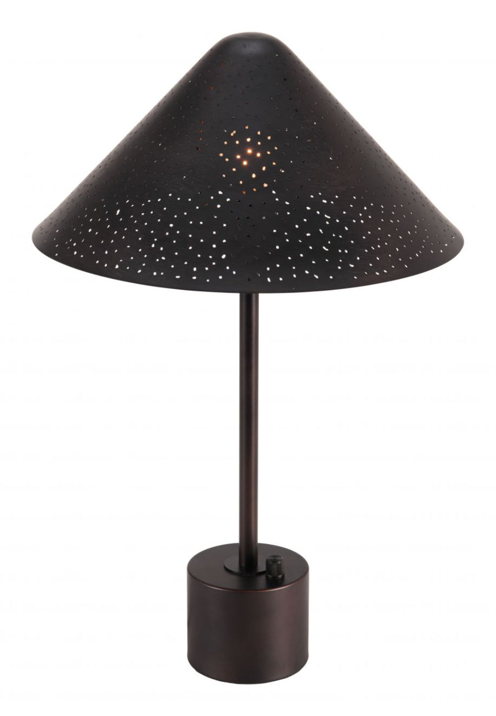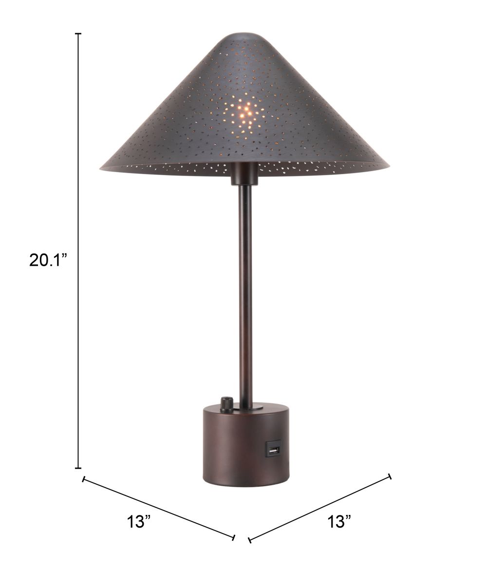 The Zuo Modern Cardo Table Lamp combines industrial charm with modern functionality. Crafted with a sturdy electroplated steel base in warm bronze, its sleek lines and minimalist design complement both contemporary and transitional interiors. Standing 20.1 inches tall with a 13-inch width and depth, it is perfect for nightstands, desks, or accent tables. Equipped with a G50 E12 bulb socket (bulb not included), integrated dimming rotary switch, and a convenient USB-A port at the base, the Cardo lamp provides both practical lighting and device charging. Its compact form and refined details make it a versatile statement piece for any room.