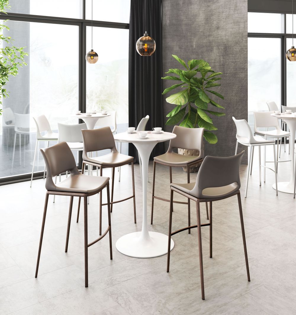 Bring a touch of modern sophistication to your home or office with the Ace Barstool Set of 2 by Zuo Modern. Featuring a brown faux leather seat and walnut faux wood steel frame, these barstools provide both style and ergonomic comfort. With a height of 40.9" H, they are ideal for kitchen islands, home bars, or office counters.