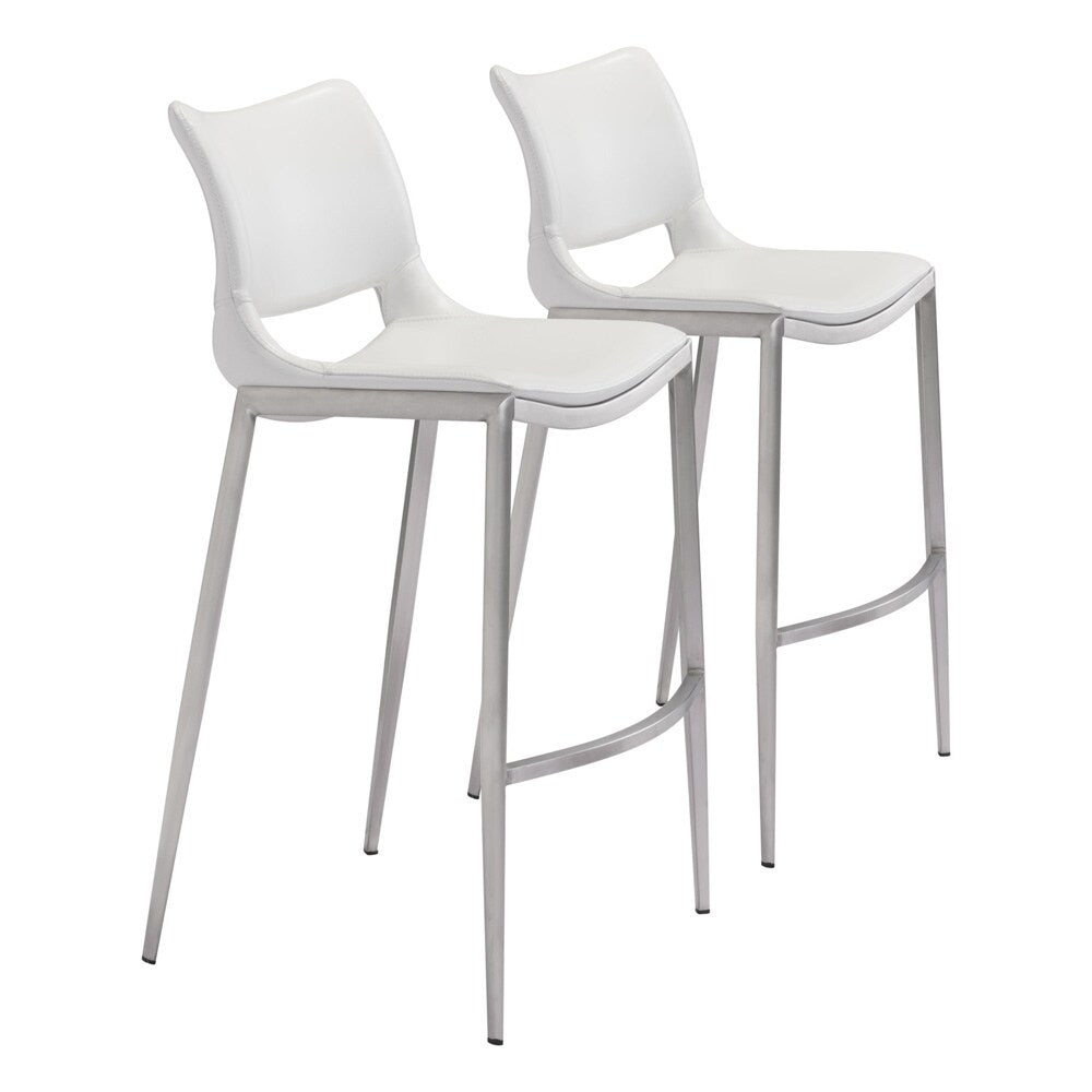 Upgrade your home or office seating with the Ace Barstool Set of 2 by Zuo Modern. Featuring a sleek white faux leather seat and brushed stainless steel frame, these barstools combine modern style with functional comfort. Measuring 40.9" H, they perfectly complement kitchen islands, home bars, or workspace counters.
