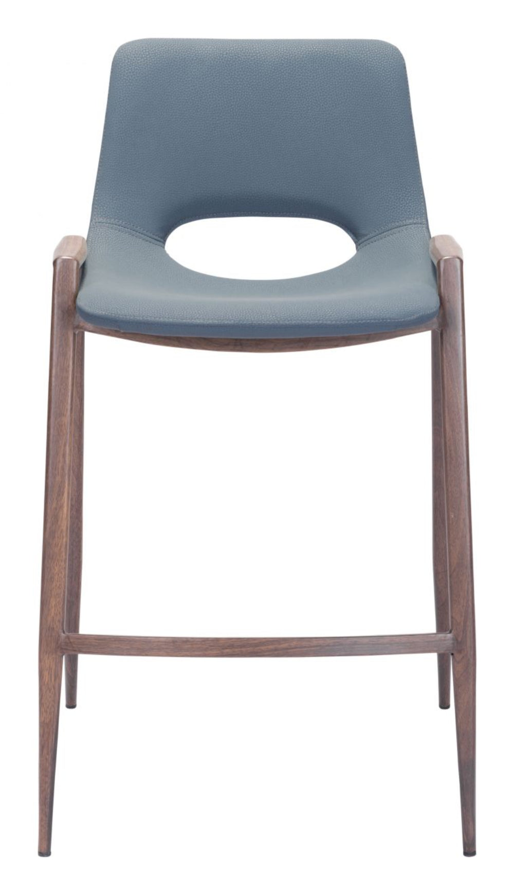 The Zuo Modern Desi Counter Stool set of 2 blends mid-century modern charm with durable construction. Upholstered in smooth azure gray faux leather, the seat rests on a sleek walnut-finished steel frame for a clean, retro-inspired look.