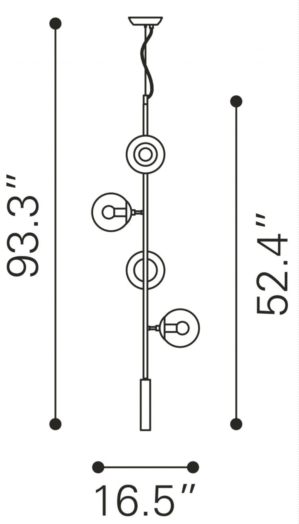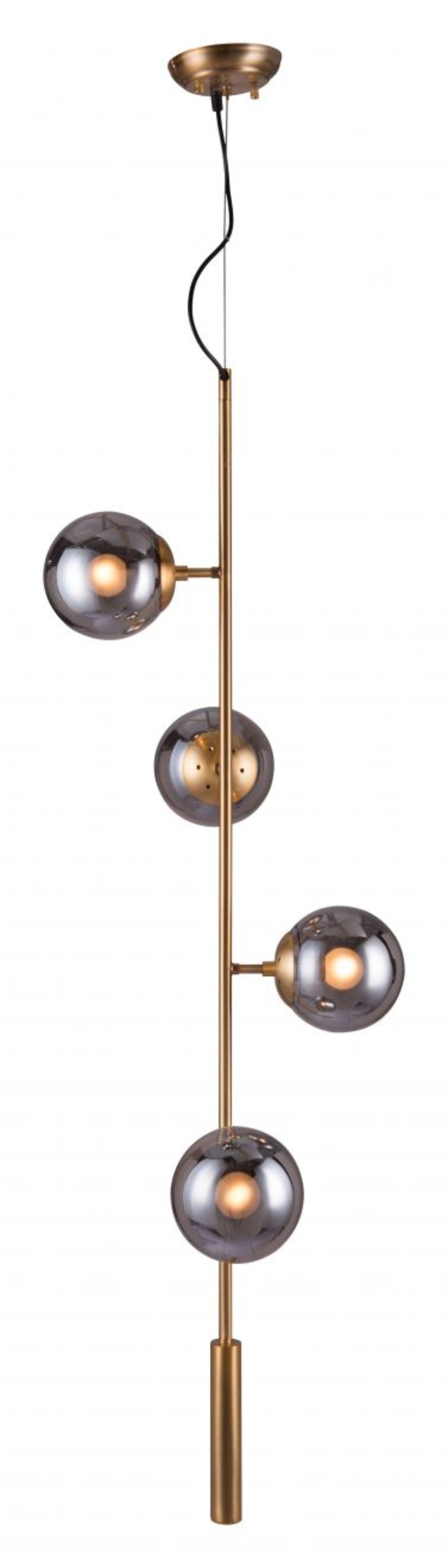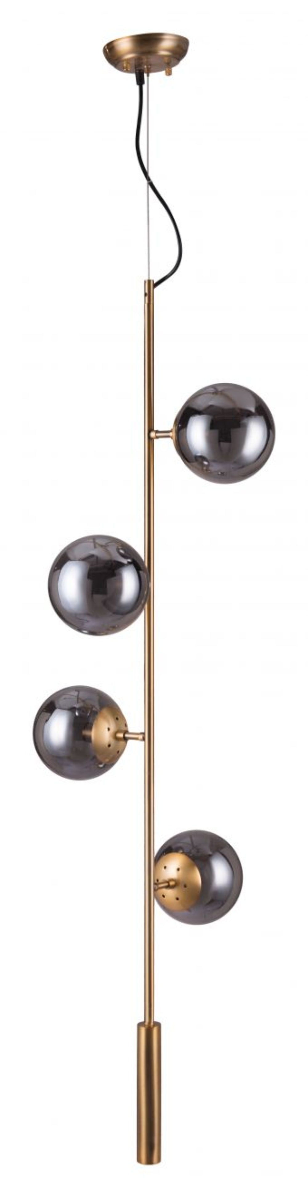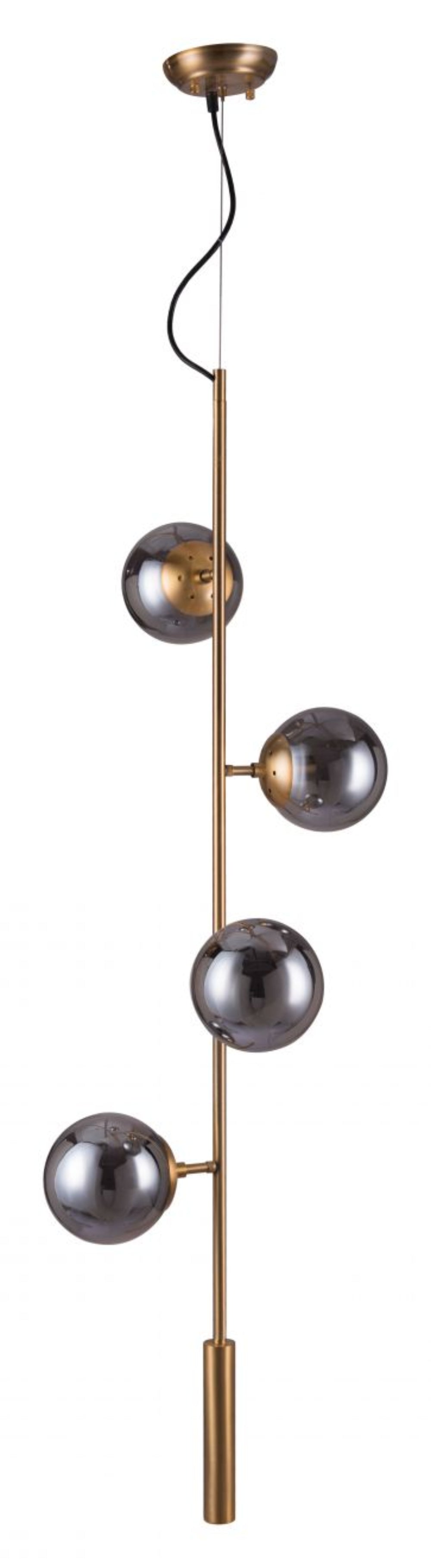 Elevate your interiors with the Zuo Modern Zatara Ceiling Lamp, where modern minimalism meets vintage glam. Featuring a gold electroplated steel frame with smoky tinted glass globe shades, this dramatic pendant offers upscale lighting in a slender yet tall silhouette. Standing 93.3 inches high, it’s the perfect statement piece for lobbies, high ceilings, modern kitchens, and contemporary hotels. Includes four E12 sockets compatible with G50 bulbs (not included), and is fully UL-approved for safety and reliability.